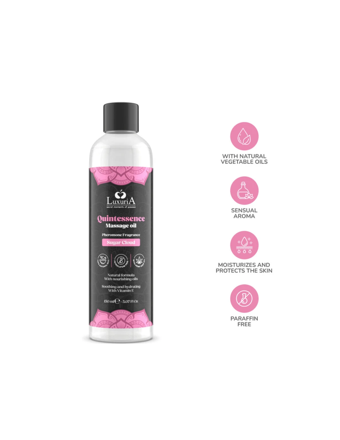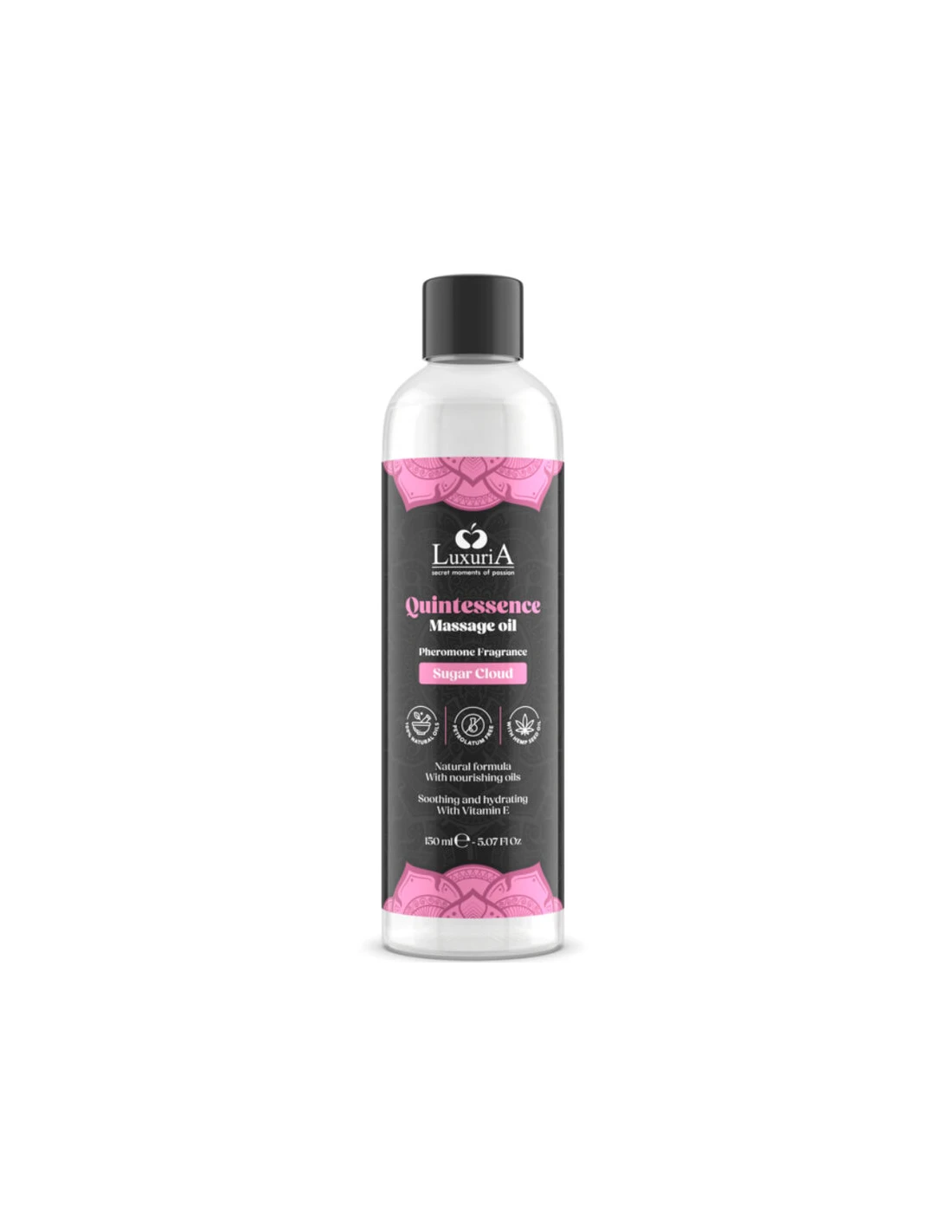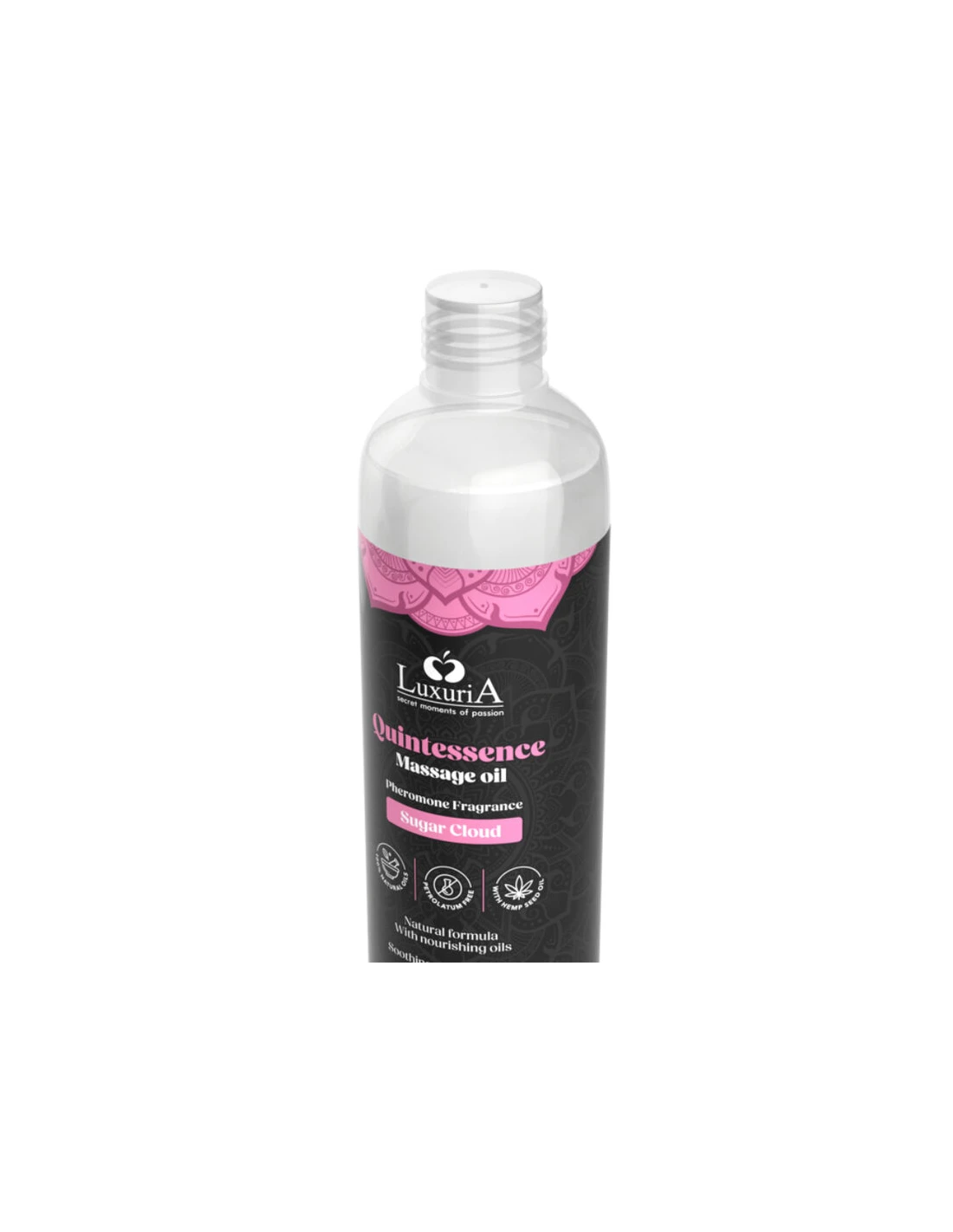 Quintessence Massage Oil, Nube de azúcar. Es un aceite natural y refinado para masajes, enriquecido con formulaciones exclusivas a base de aceites de alta calidad y esencias estimulantes cuidadosamente seleccionadas. Su fórmula nutritiva, elaborada con aceites vegetales completamente naturales, combinada con aromas sensuales, proporciona una hidratación intensa, dejando la piel suave y perfumada. Libre de parafina, el aceite Quintessence Massage Oil respetará y protegerá tu piel gracias a la presencia de aceite de semillas de cáñamo, estimulando tus sentidos con suaves notas de azúcar glas que te acompañarán durante todo el masaje, guiándote hacia la Quintessencia del placer.