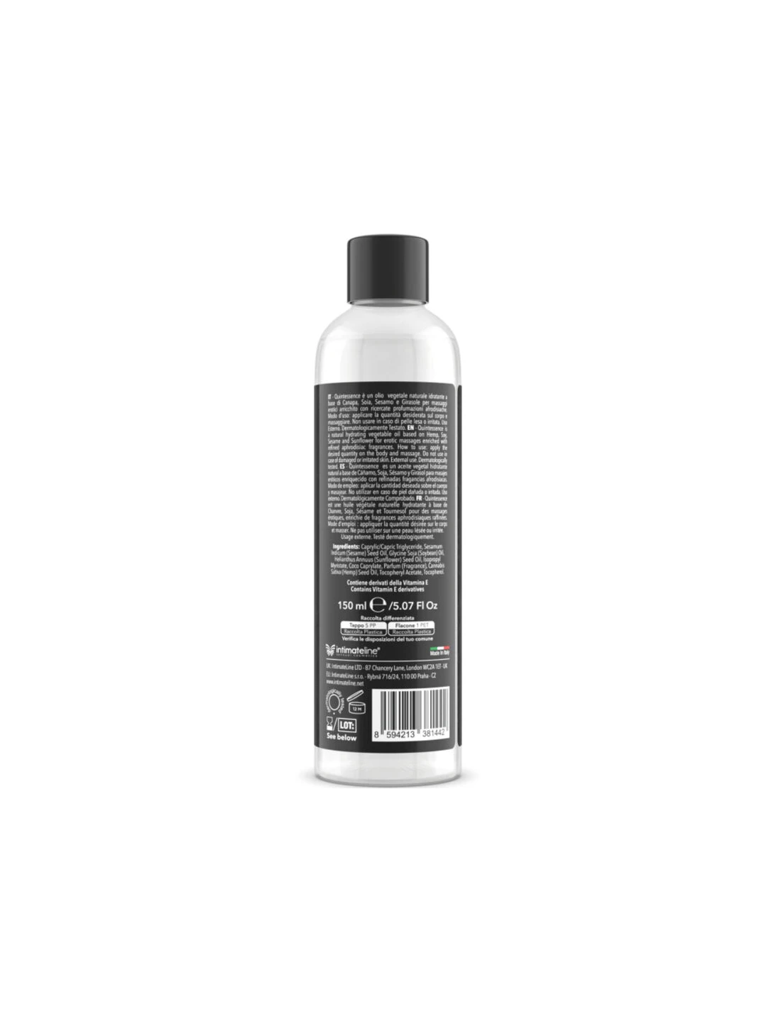 - Sin parafina y sin tintes. Quintessence Massage Oil no contiene parafina ni colorantes, lo que te permitirá disfrutar plenamente de cada momento de placer con total seguridad. Su fórmula ha sido concebida para deslizarse suavemente sobre tu piel, manteniéndola siempre segura y libre de incomodidades.