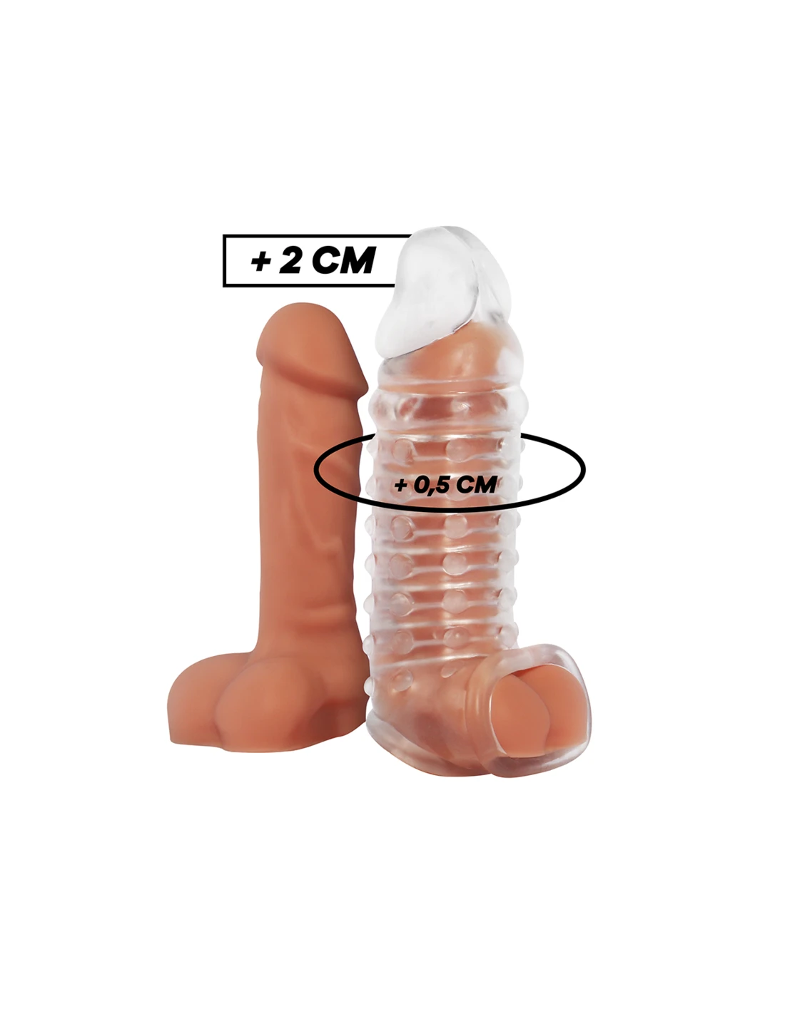Cumple emocionantes fantasías cuando deslizas tu pene en la funda y tu escroto en la correa. Una vez que se asegure esta manga de extensión, tendrás más longitud y circunferencia para jugar con total sujeción.