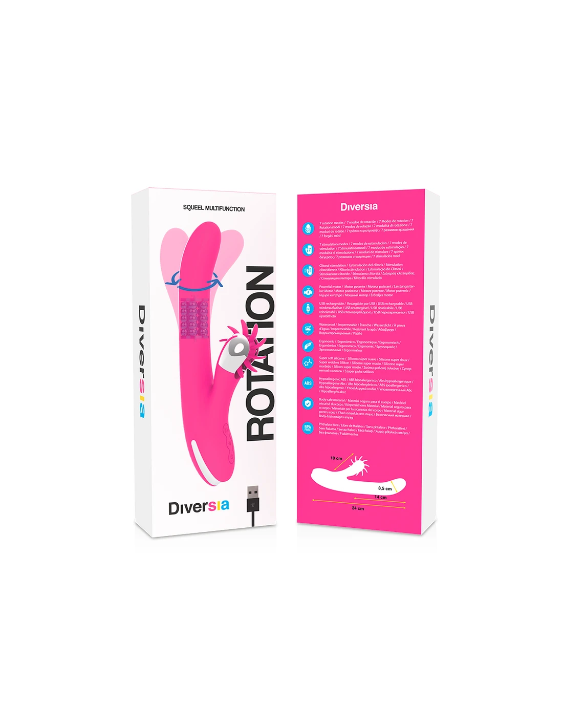 La gama DIVERSIA BUNNY ROTATION incorpora una base de suaves perlas giratorias y cabezal curvo oscilante que te llevaran al clímax, gracias al contacto con el punto G.