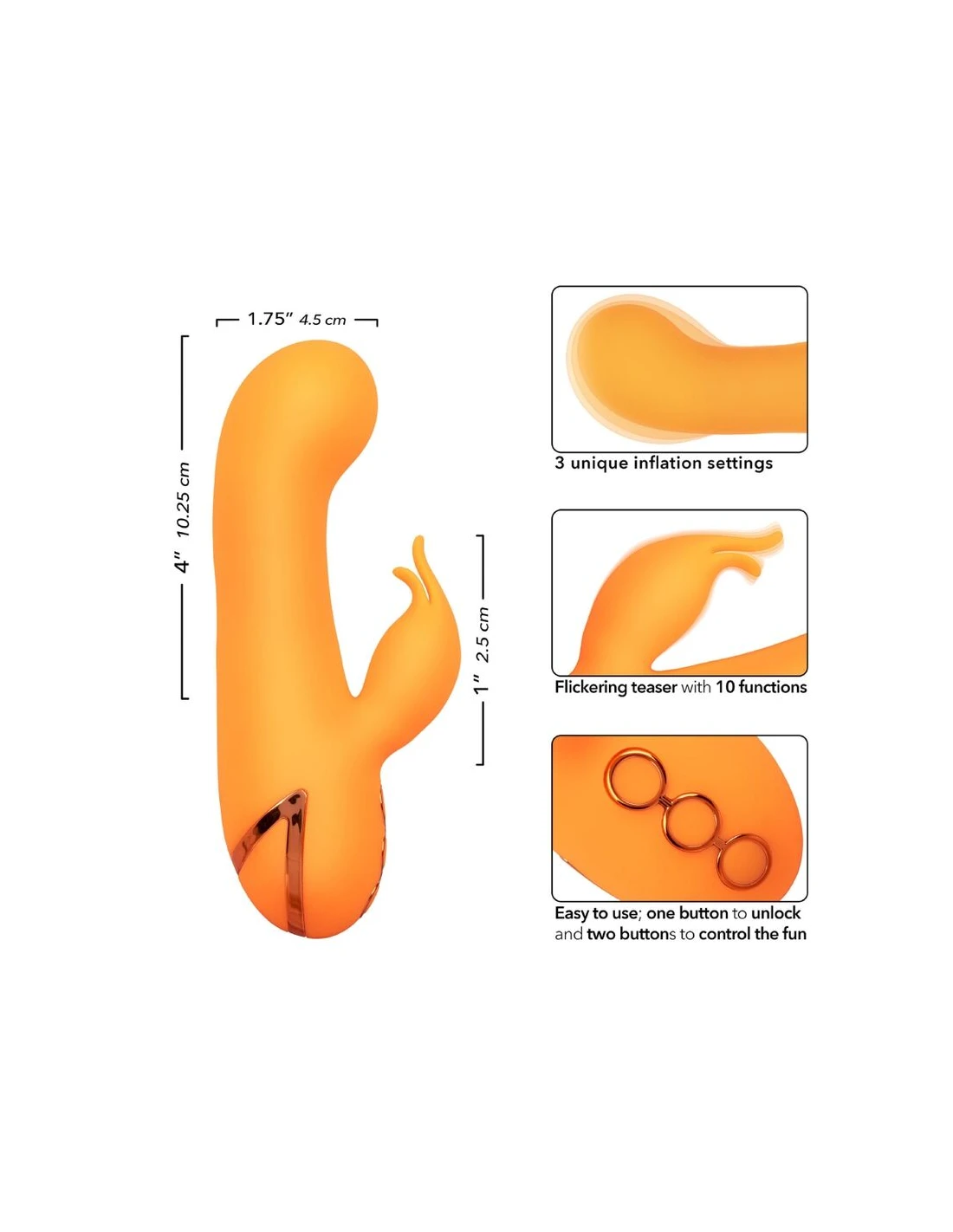 - Estimulador dual potente, compacto y vibratorio con inflado automático.