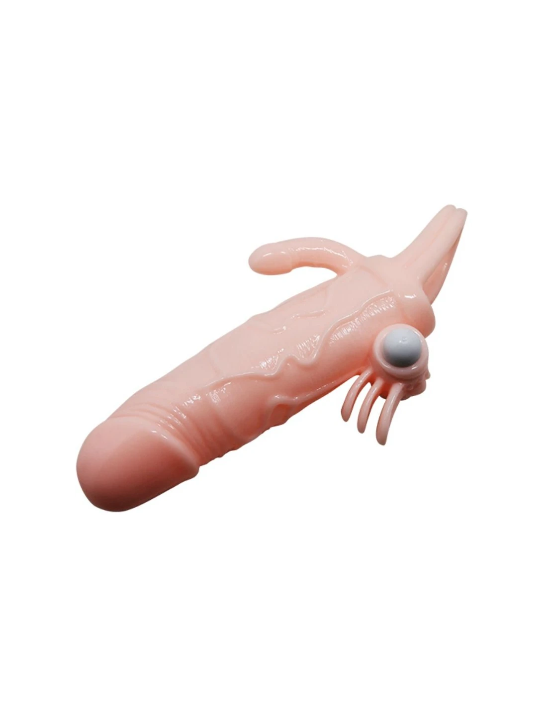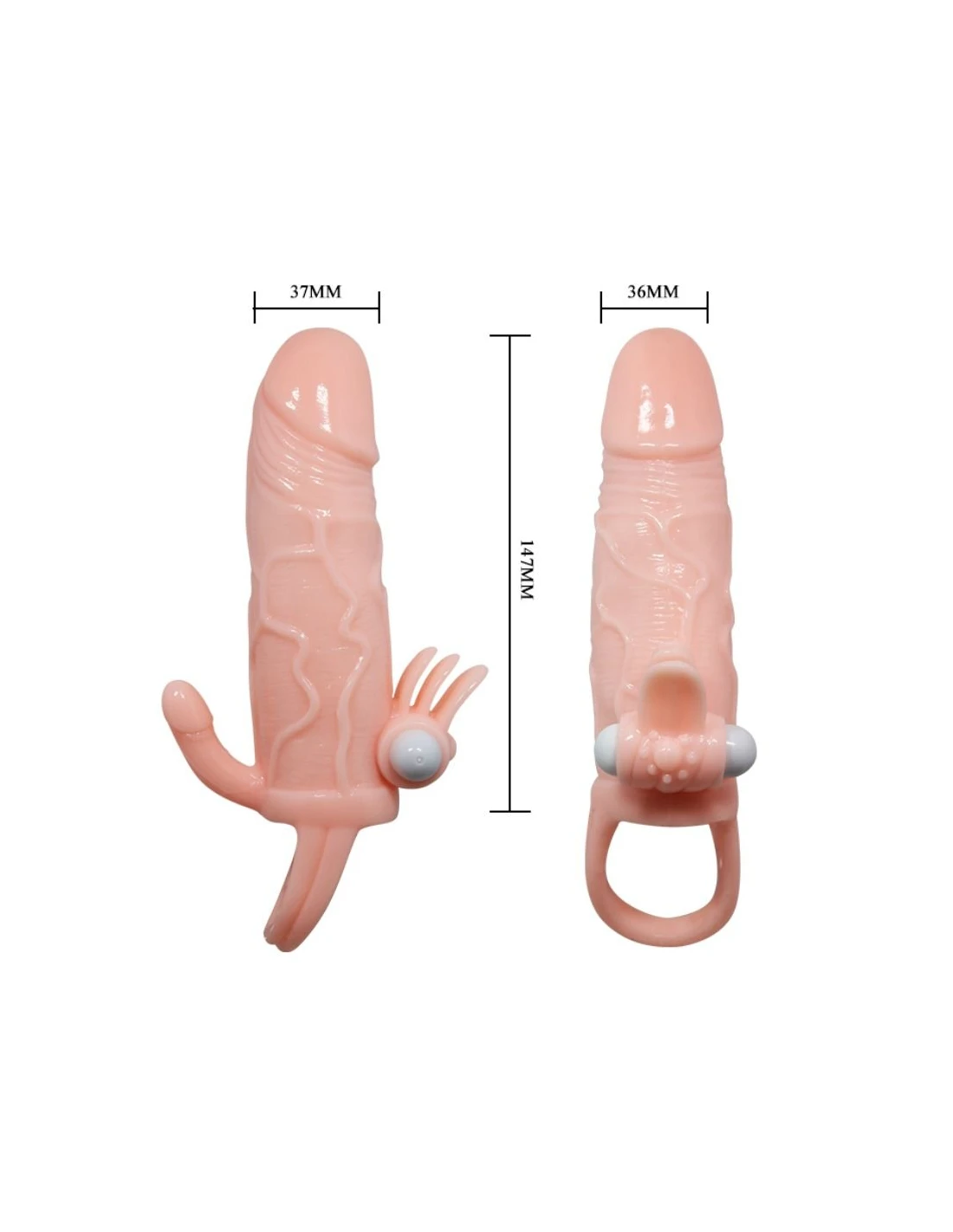 Aumenta la duración y el placer en tus relaciones con esta fantástica funda realística para el pene. Con todo lujo de detalles, incorpora además unos traviesos pliegues con una potente bala que estimulará el clítoris de tu pareja. En el lado contrario, una prolongación con forma de minipene para estimulación anal.