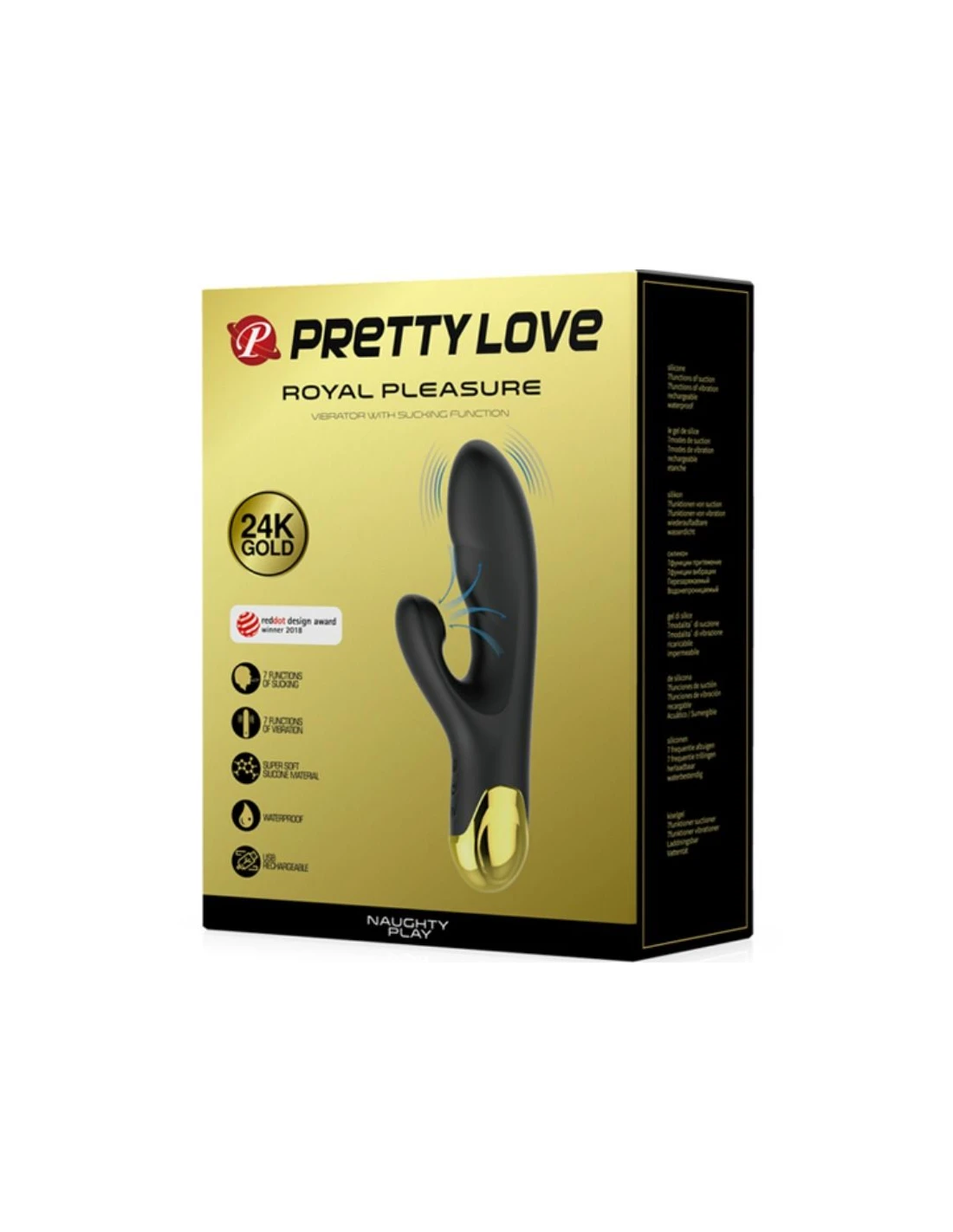Pretty Love-Naughty, con un elegante diseño, es una serie de lujo de juguetes sexuales hecha con silicona líquida médica gradual y aleación de zinc bañada en oro de 24 kilates. Este juguete con 7 funciones de vibración y 7 modos de succión. Una función de memoria inteligente garantiza que se preserven la configuración favorita siempre que se utilice.