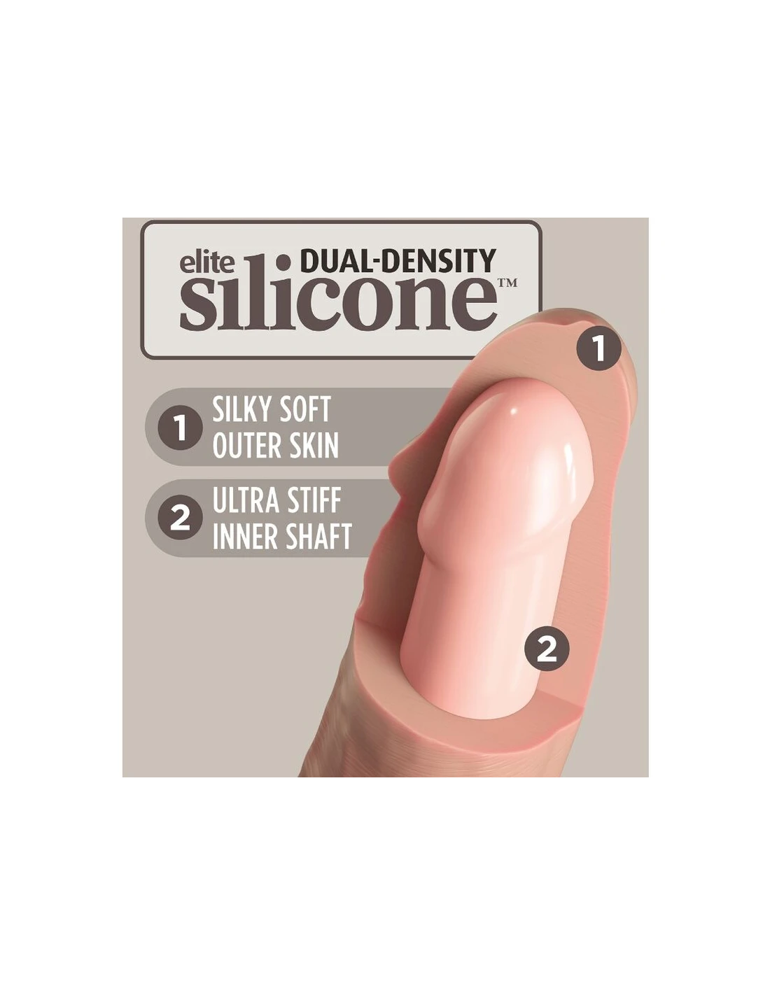 El consolador de silicona King Cock Elite incluido está hecho de silicona Elite de doble densidad de alta calidad. Cada King Cock se elabora de manera responsable con materiales que cumplen con las normas y se revisa cuidadosamente para que cumpla con nuestras pautas de máxima calidad. Puedes disfrutar de cada obra maestra de King Cock con total confianza.
