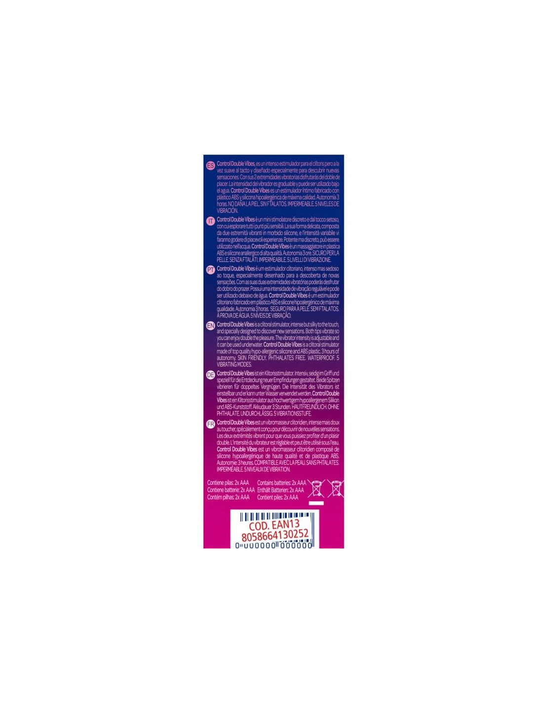 Con sus 2 extremidades vibratorias disfrutarás del doble de place. La intensidad del vibrador es graduable y puede ser utilizado bajo el agua. Control Double Vibes es un estimulador íntimo fabricado con plástico ABS y silicona hipoalergénica de máxima calidad.