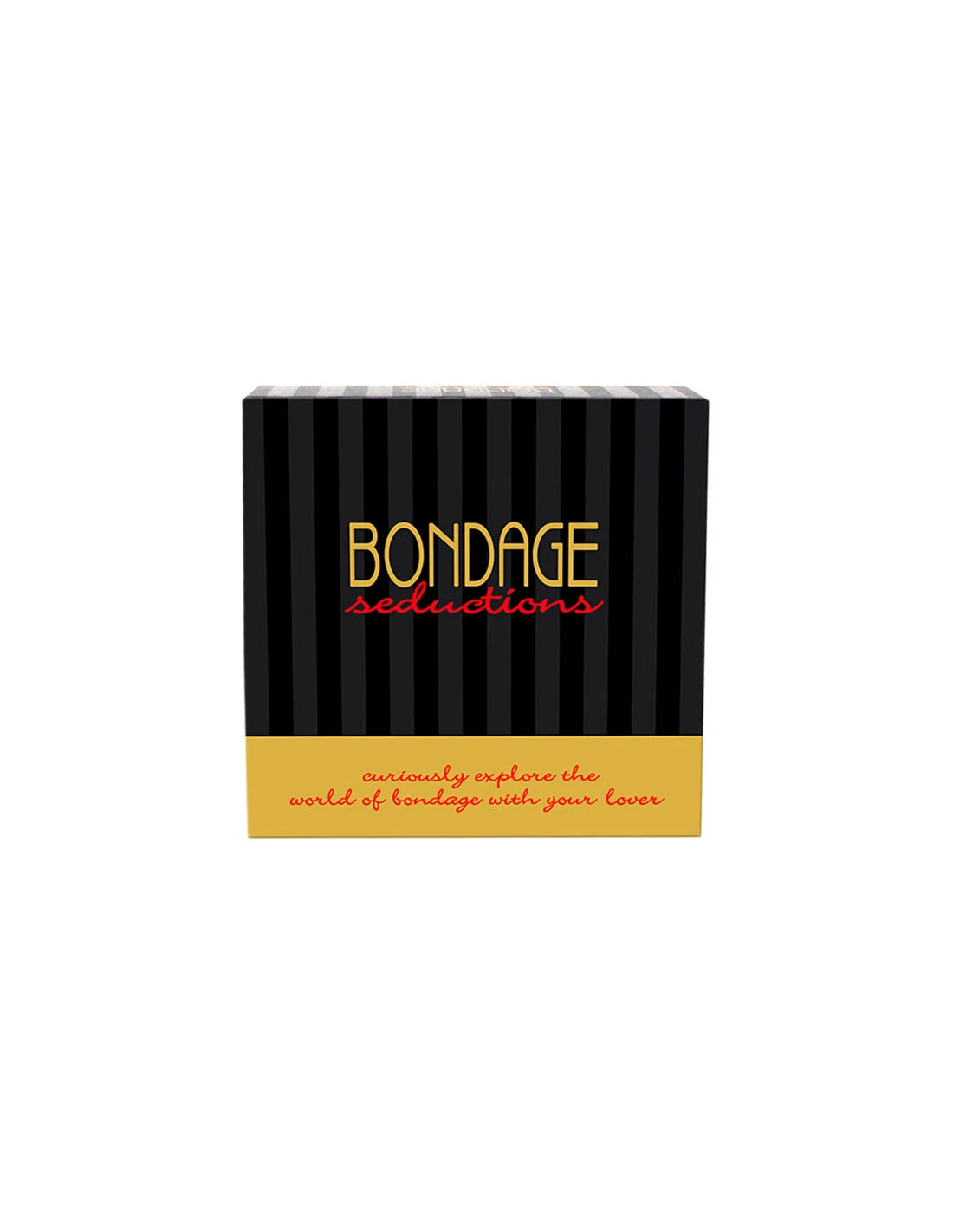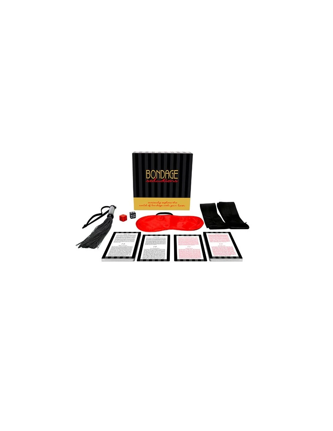 Contiene 36 tarjetas de Bondage Seduction, 2 cuerdas de seda, 2 dados, 1 vendaje para los ojos, 1 látigo de goma y las instrucciones.
