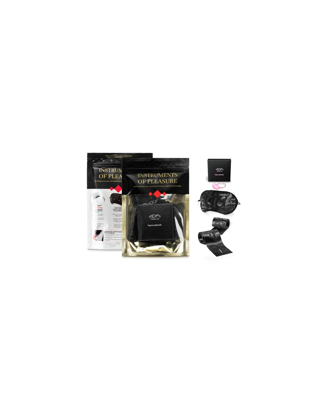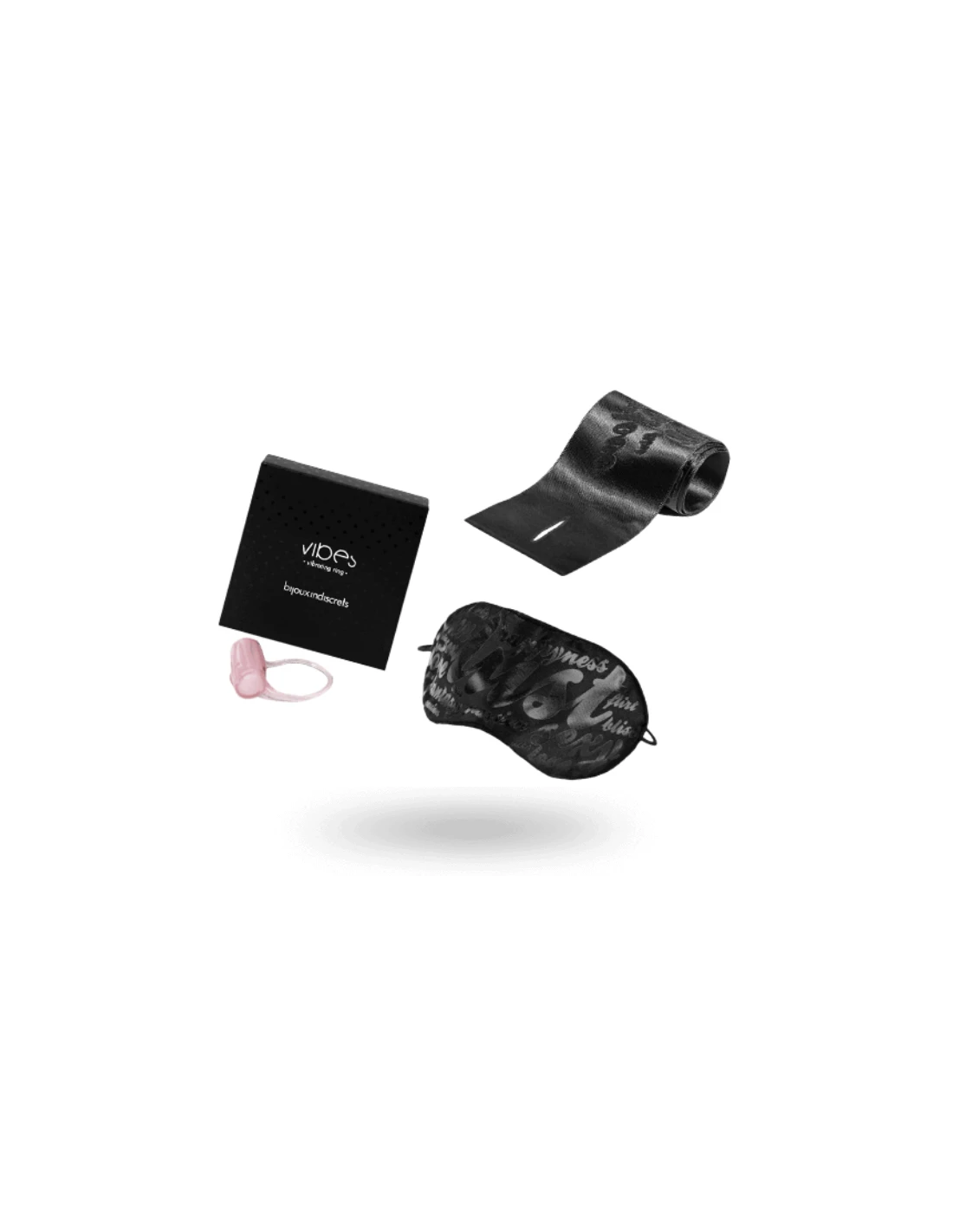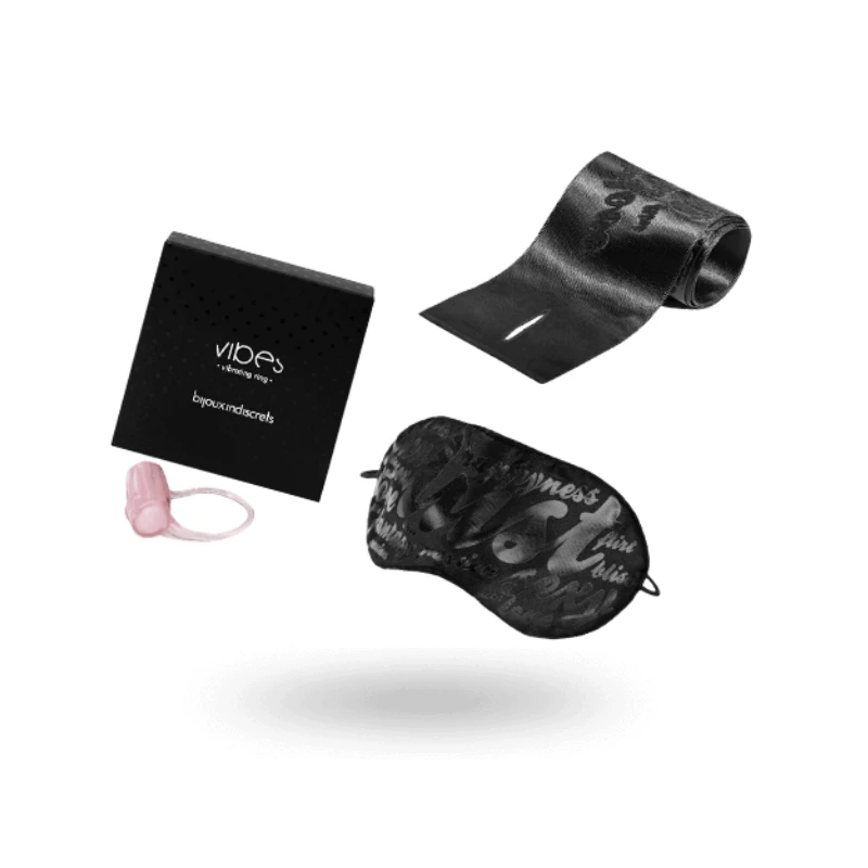 - Contenidos: Anillo vibrador; Esposas de satén; Antifaz satinado.