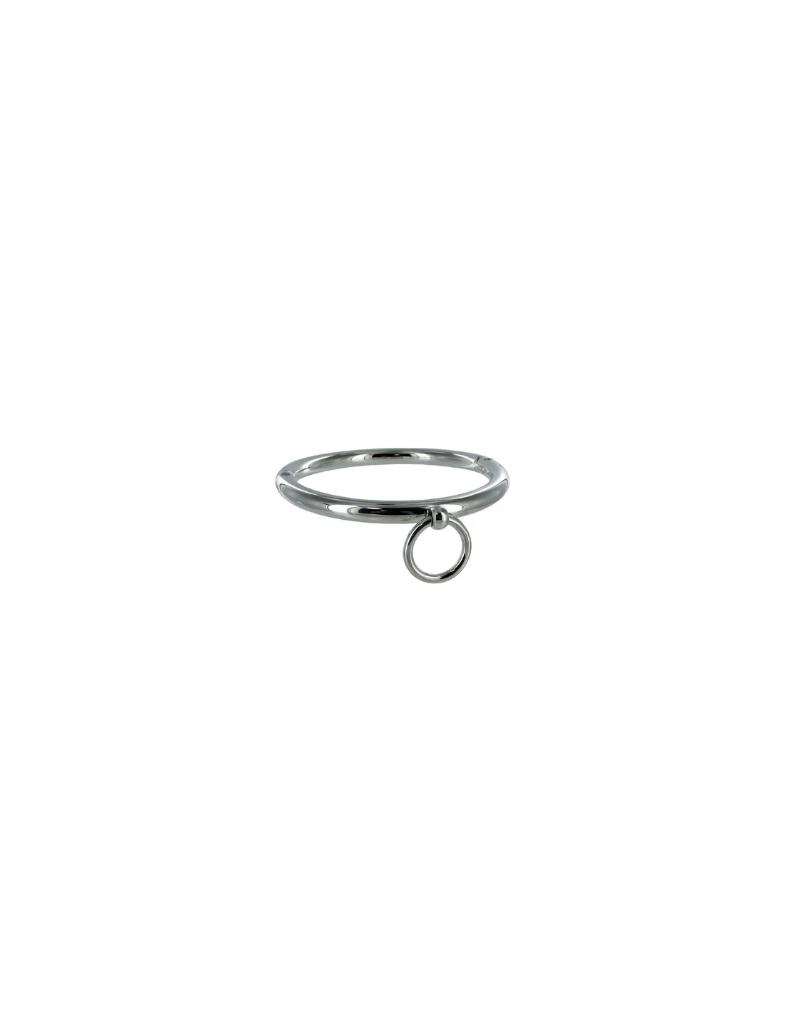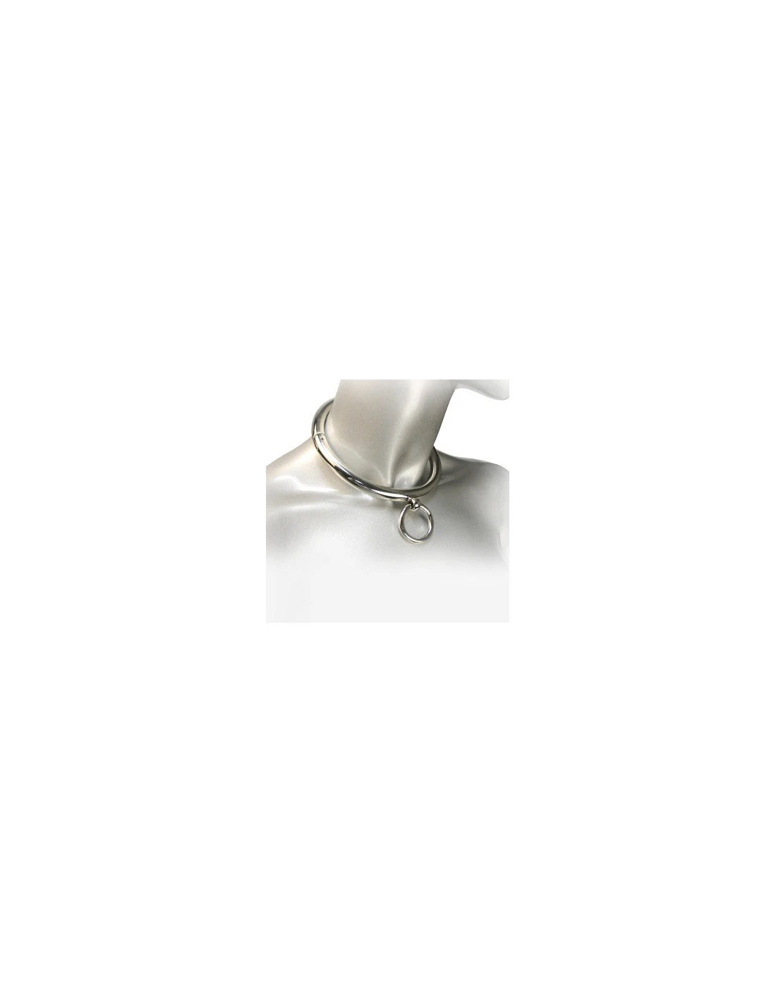 Este collar de metal cromado se cierra con una llave allen incluida. Tiene un acabado brillante y puede ser utilizado como pieza de joyería para llevar en la calle públicamente. El collar tiene una anilla en O para enganchar una cadena con mosquetón, una cuerda o cualquier otro artículo de bondage.
