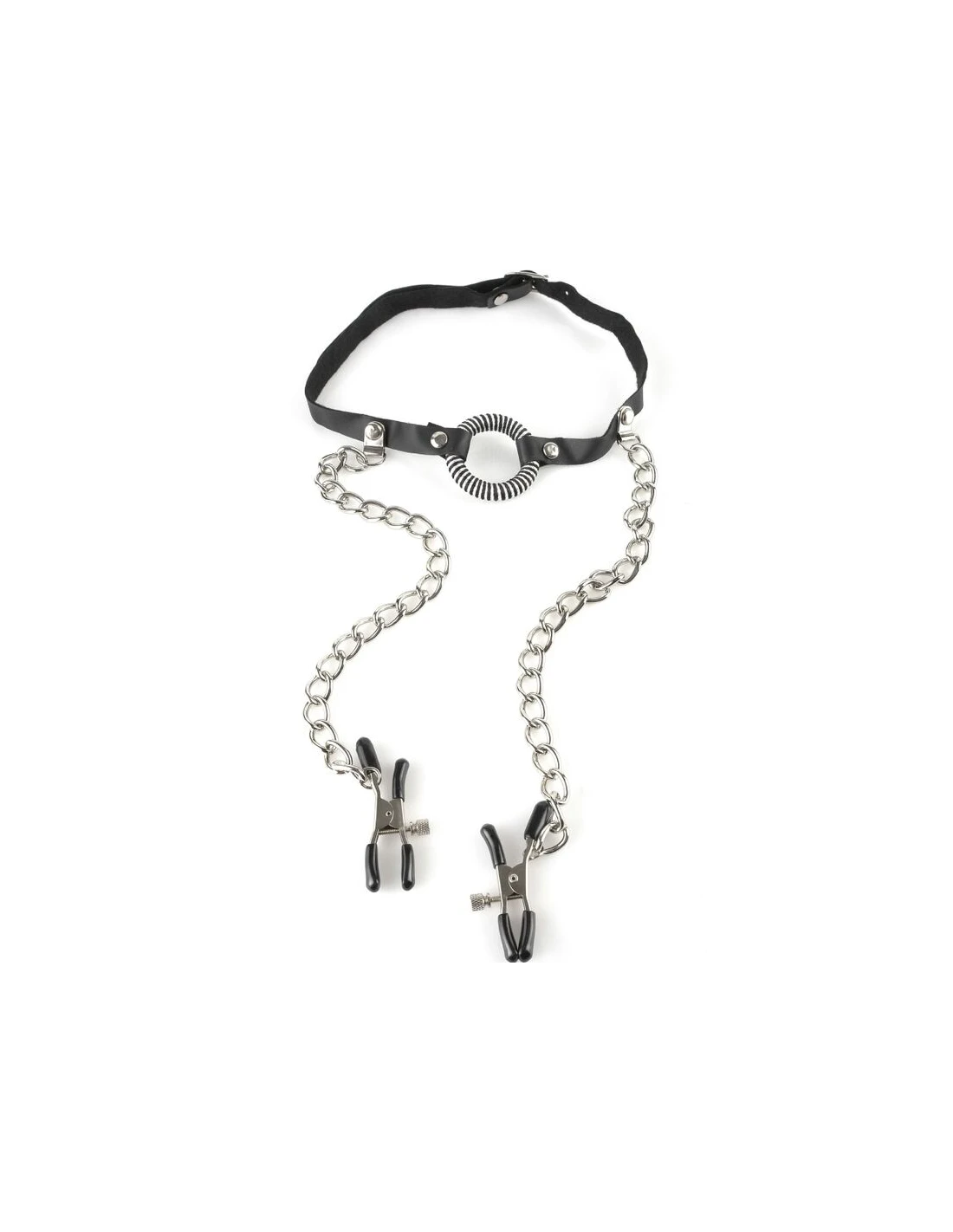 El producto consiste en un pequeño anillo de metal como mordaza, envuelto en cuero, conectado a dos correas también de cuero resistente para ajustarlo al cuello y dos cadenas con pinzas para los pezones. Gracias a sus correas de cuero regulables, puede adaptarse a los tamaños y tensiones deseadas. Tirando del anillo con la boca abierta, controlas la tensión de las pinzas. Las correas de cuero son ajustables para adaptarse a la mayoría de los tamaños.