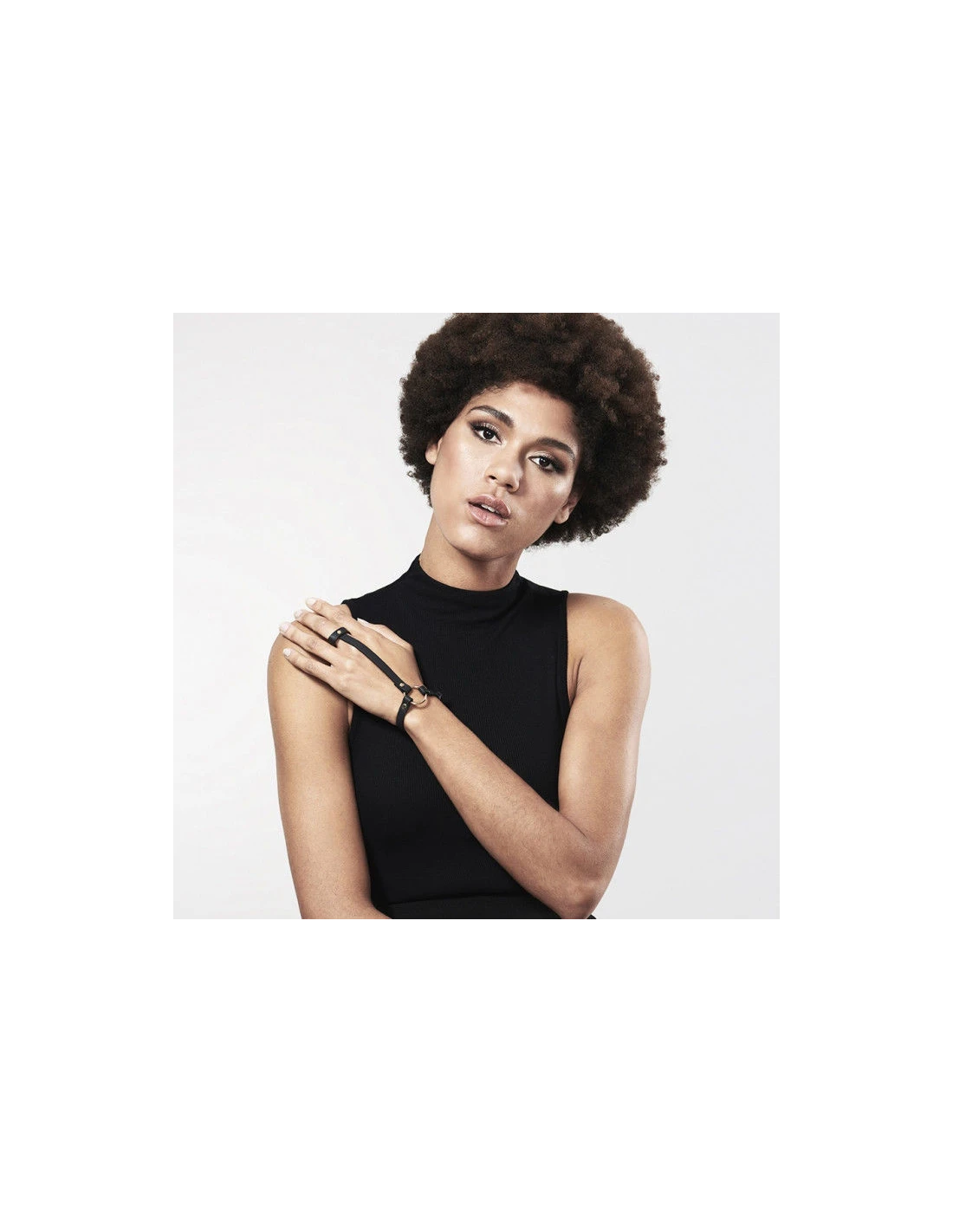 Pasa tu dedo índice dentro de la correa y ajusta el otro extremo a tu muñeca. Este accesorio es ideal para dar un toque rompedor a tus conjuntos.