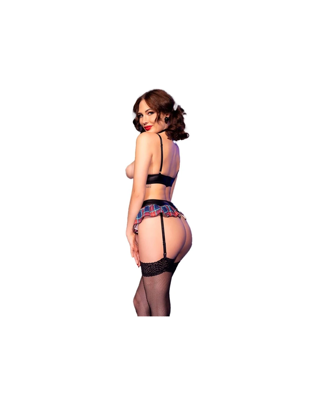 La minifalda con tirantes de liga resalta tus piernas, mientras que la tanga picante y las medias de rejilla aportan el toque perfecto de descaro.