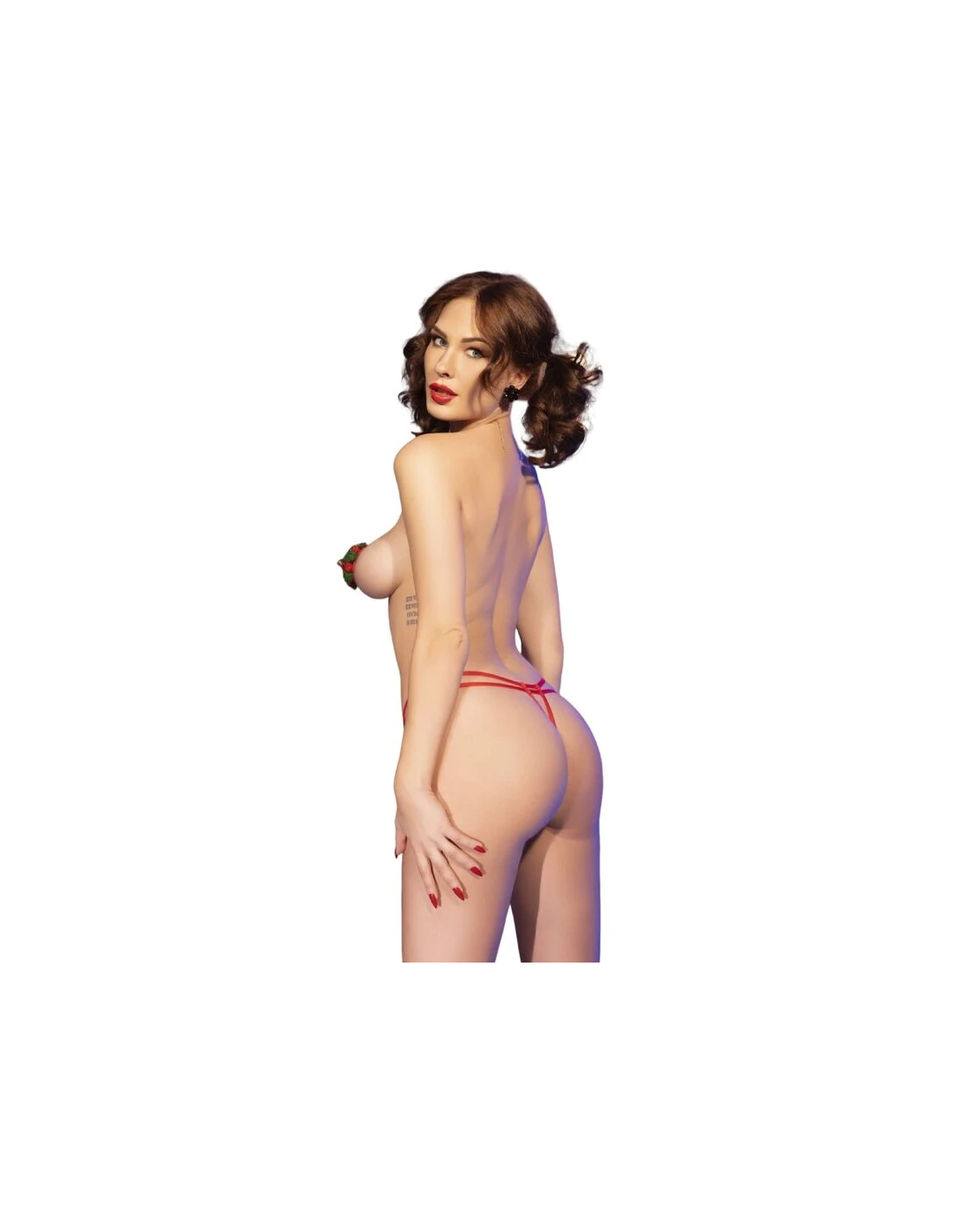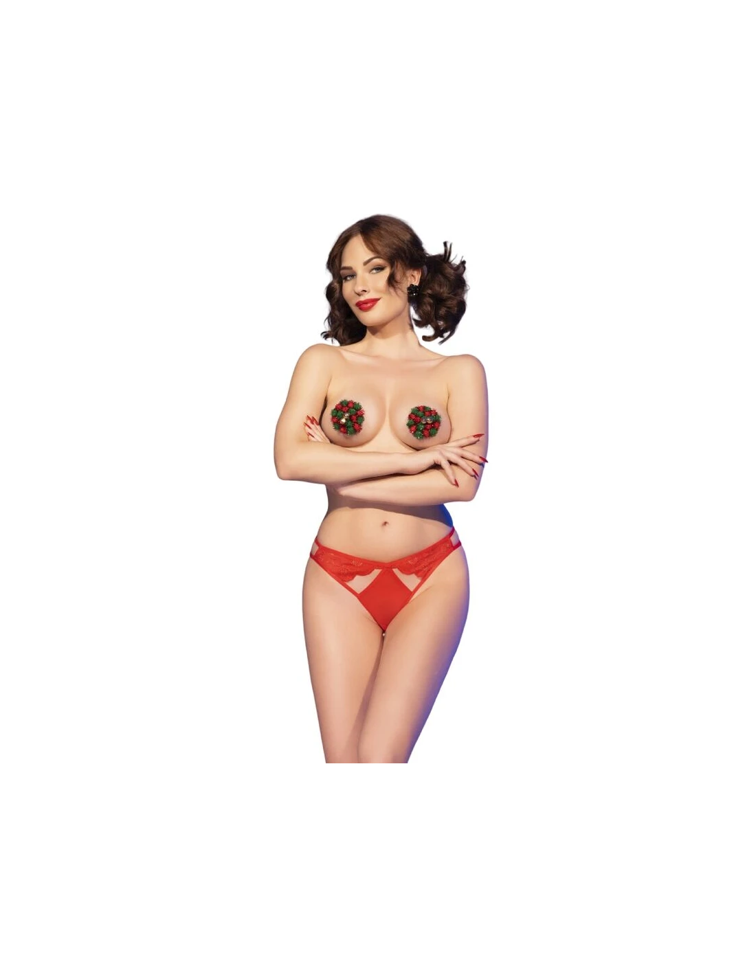 Sumérgete en el alegre espíritu navideño con este encantador conjunto. Compuesto por lindos cubre pezones y braguitas rojas a juego, este conjunto es perfecto para abrazar la atmósfera mágica de las fiestas.