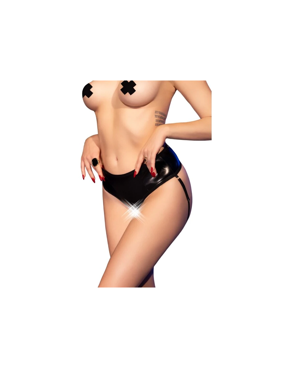 Braguitas picantes de abertura confeccionadas en material similar al cuero. Se atan en la parte posterior para un ajuste perfecto y cuentan con dos correas ajustables que realzan y acentúan tentadoramente los glúteos.