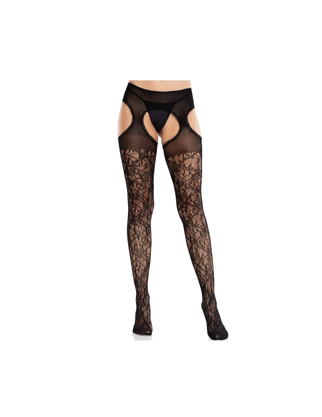 LEG AVENUE - MEDIAS DE ENCAJE FLORAL CON LIGAS UNIDAS NEGRO