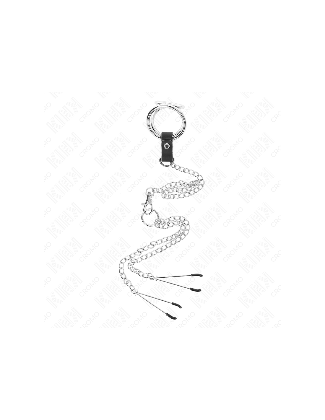 KINK - ANILLO PENE TRIPLE METAL CROMADO 3 CM A 4.5 CM CON CADENA METAL 26 CM Y PINZAS PARA PEZONES