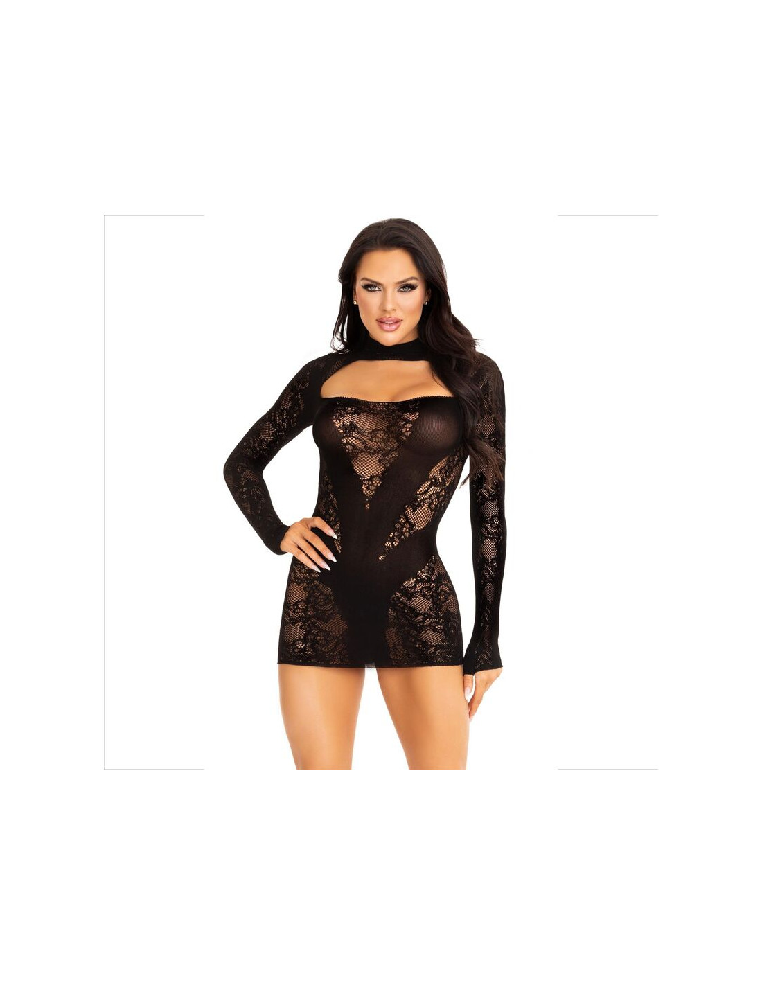LEG AVENUE - MINI VESTIDO DE ENCAJE CON MANGA LARGA NEGRO