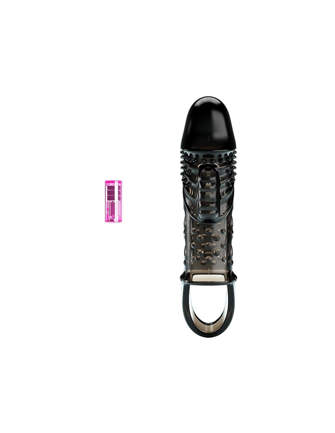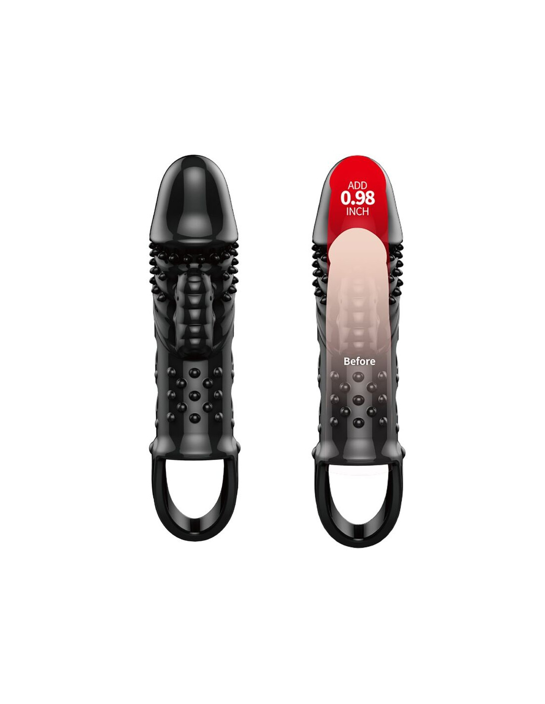 Diviértete con esta funda vibradora para el pene. Esta funda para pene que mejora la erección y promete placer está hecha de TPR suave y está asegurada en su lugar por un lazo de bola. Un vibrador en la punta extiende la longitud de su pene y se activa al contacto. Estimulando la cabeza de su eje, también proporciona estimulación interna para ella. La funda elástica envuelve su pene para una erección más fuerte y duradera, ¡lo que le da más tiempo para disfrutar de las vibraciones!