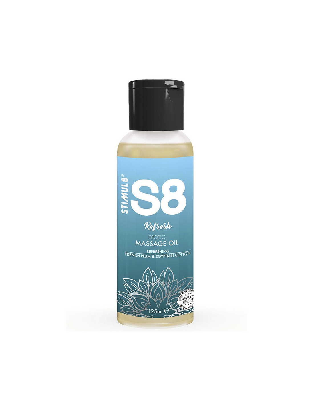 Estos ricos aceites de masaje S8 son una mezcla única de 3 potentes aceites: aceite de jojoba que calma y fortalece la piel, aceite de almendras para hidratar y cuidar, y aceite de sésamo, altamente nutritivo y lubricante. Este aceite S8 está enriquecido con vitaminas y minerales esenciales. Después de un buen masaje, su piel se sentirá sedosa, suave y relajada. Hay 3 aromas diferentes disponibles: Vitalize - Lima Omaní y Jengibre Picante, Relax - Té Verde y Flor de Lila y Refresh - Ciruela Francesa y Algodón Egipcio.