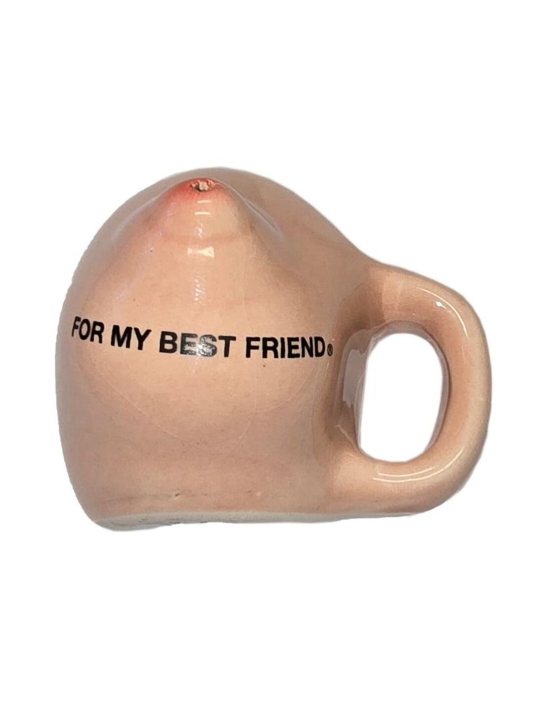 Original vaso de chupito en cerámica con forma de busto femenino, incluyendo pechos en relieve y la frase “FOR MY BEST FRIEND” en la parte superior. Además, cuenta con base imantada para poder colocarlo en superficies metálicas como la nevera, convirtiéndolo en un elemento decorativo y funcional a la vez.