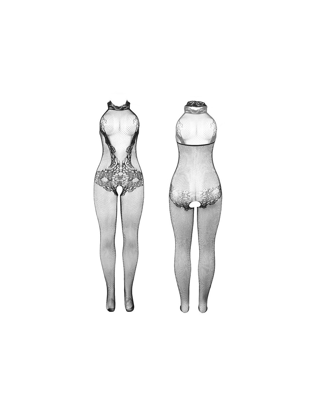 - Estilo: Bodystocking negro de rejilla y encaje con cuello alto y diseño crotchless (entrepierna abierta).