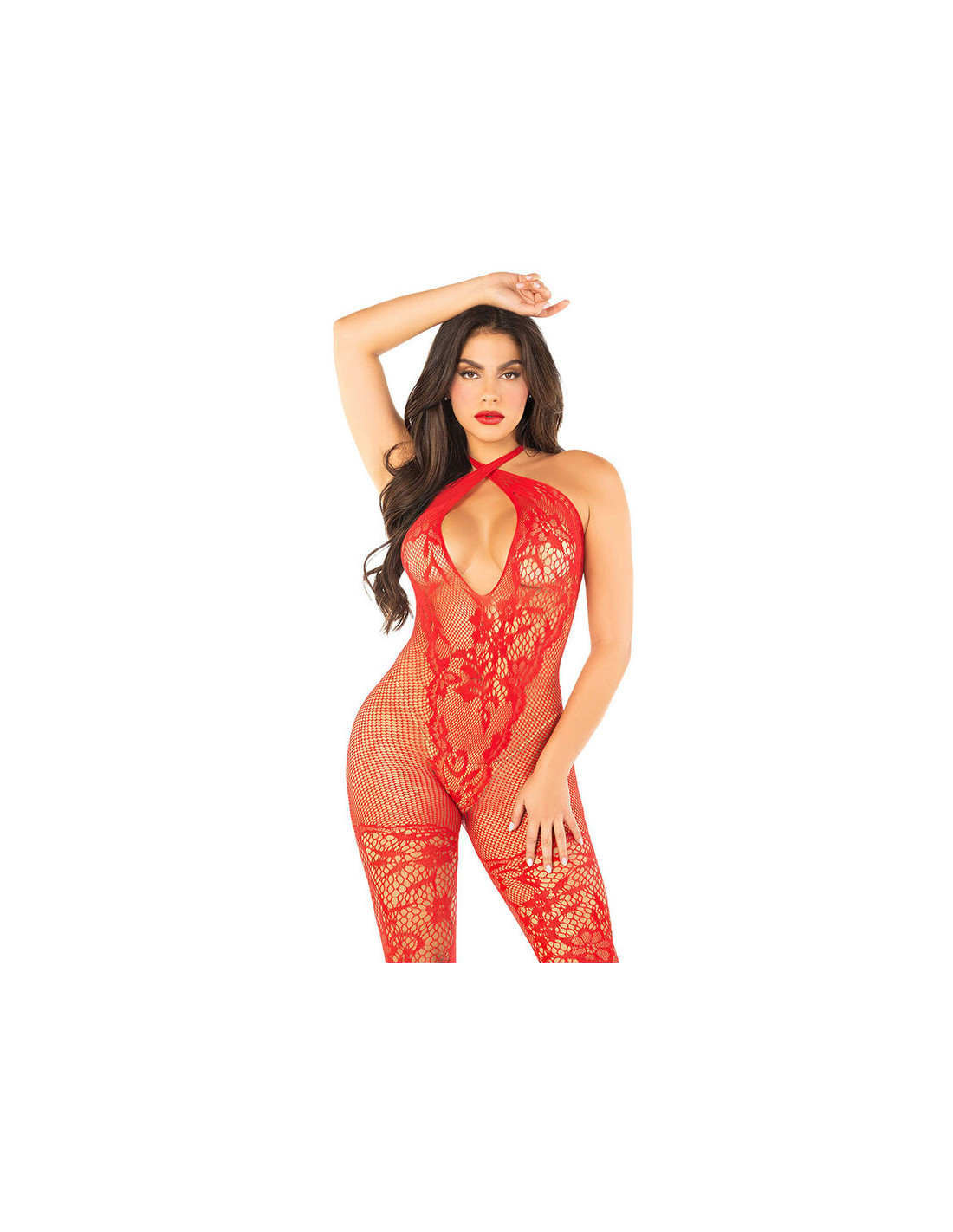 Atrévete a deslumbrar con nuestro Bodystocking de Rejilla con Estampado de Flores en Rojo.