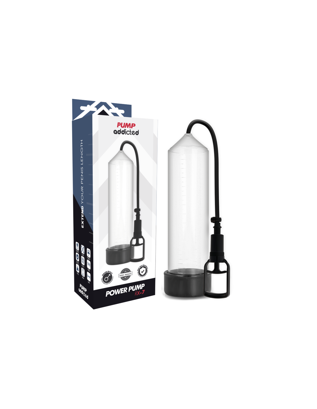 Pump Addicted ayuda a alcanzar la erección de una forma más sencilla utilizando un sistema de vacío que hace que la sangre se concentre en el pene cuando todavía está flácido. La erección se alcanza y mantiene mediante un sellado cómodo y hermético en la base del cuerpo, justo en la unión del pene con el pubis, gracias al cual se mantiene la sangre en el tronco. Gracias a la manga, el sellado es firme, cómodo y estrecho sin apretar.