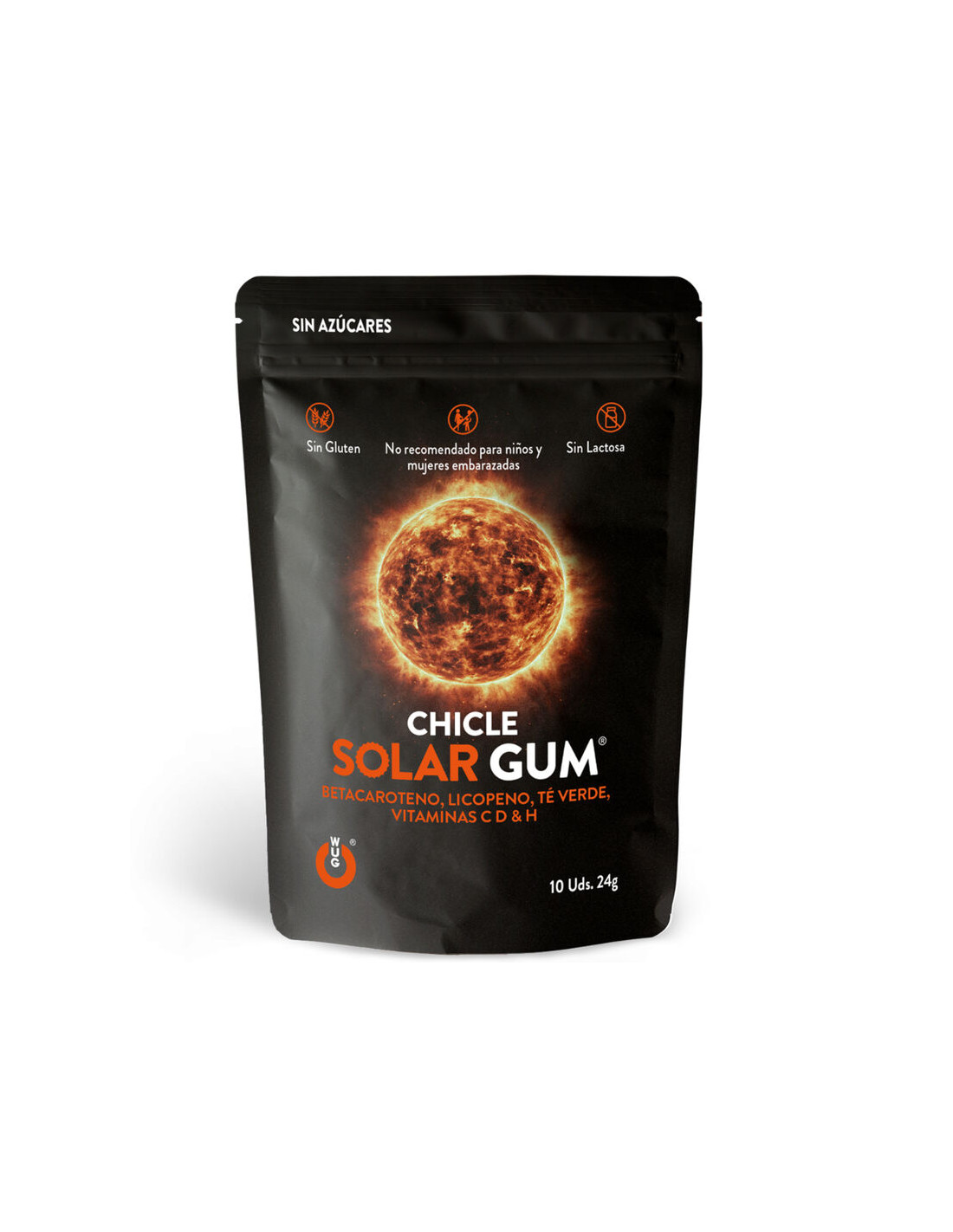 WUG CHICLE SOLAR GUM es el complemento alimenticio en formato chicle que te acompaña en verano y prepara tu piel para el sol. Con un agradable sabor tropical y sin azúcares añadidos, combina Betacaroteno, Licopeno, Vitamina C, Vitamina D, Biotina (Vitamina H) y Té Verde, ingredientes conocidos por su acción antioxidante y por contribuir al cuidado y la protección de la piel.