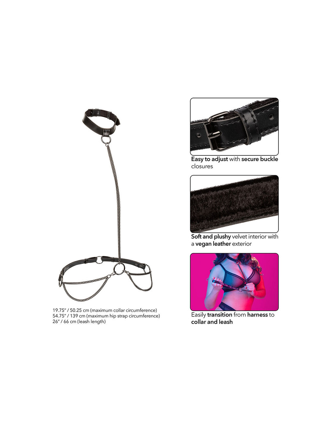 Minuciosamente elaborado para curvas seguras, este arnés premium transita sin problemas de halter a collar y correa, celebrando el espectro completo del placer.