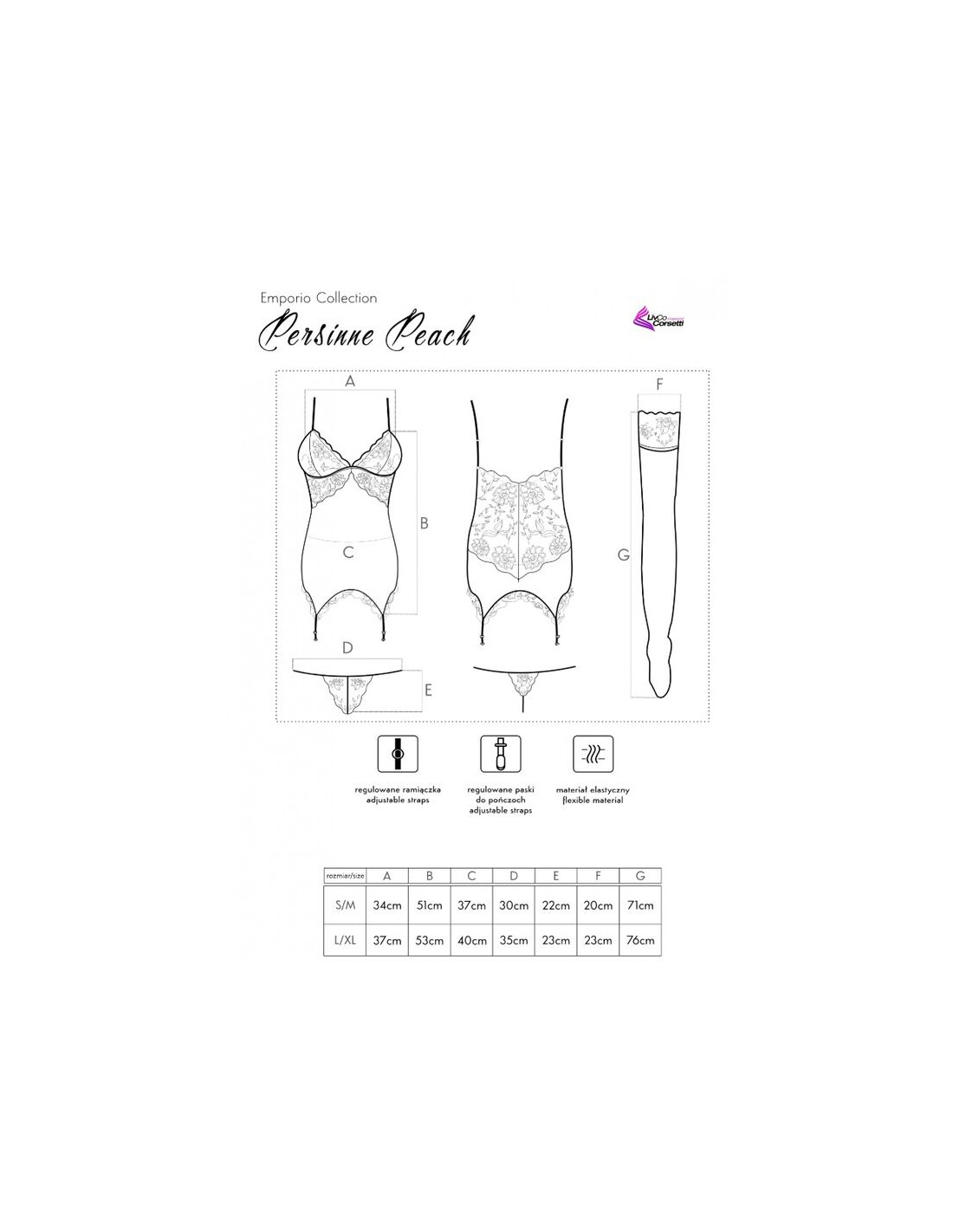 La colección Persinne Peach Emporio es un lujoso conjunto de ropa de dormir de tres piezas que contiene un corsé de tela de encaje, tangas de encaje y medias con cinturón. Se trata de la combinación perfecta pensada tanto para ocasiones especiales como para el día a día, que sin duda no debe faltar en el armario de toda mujer.