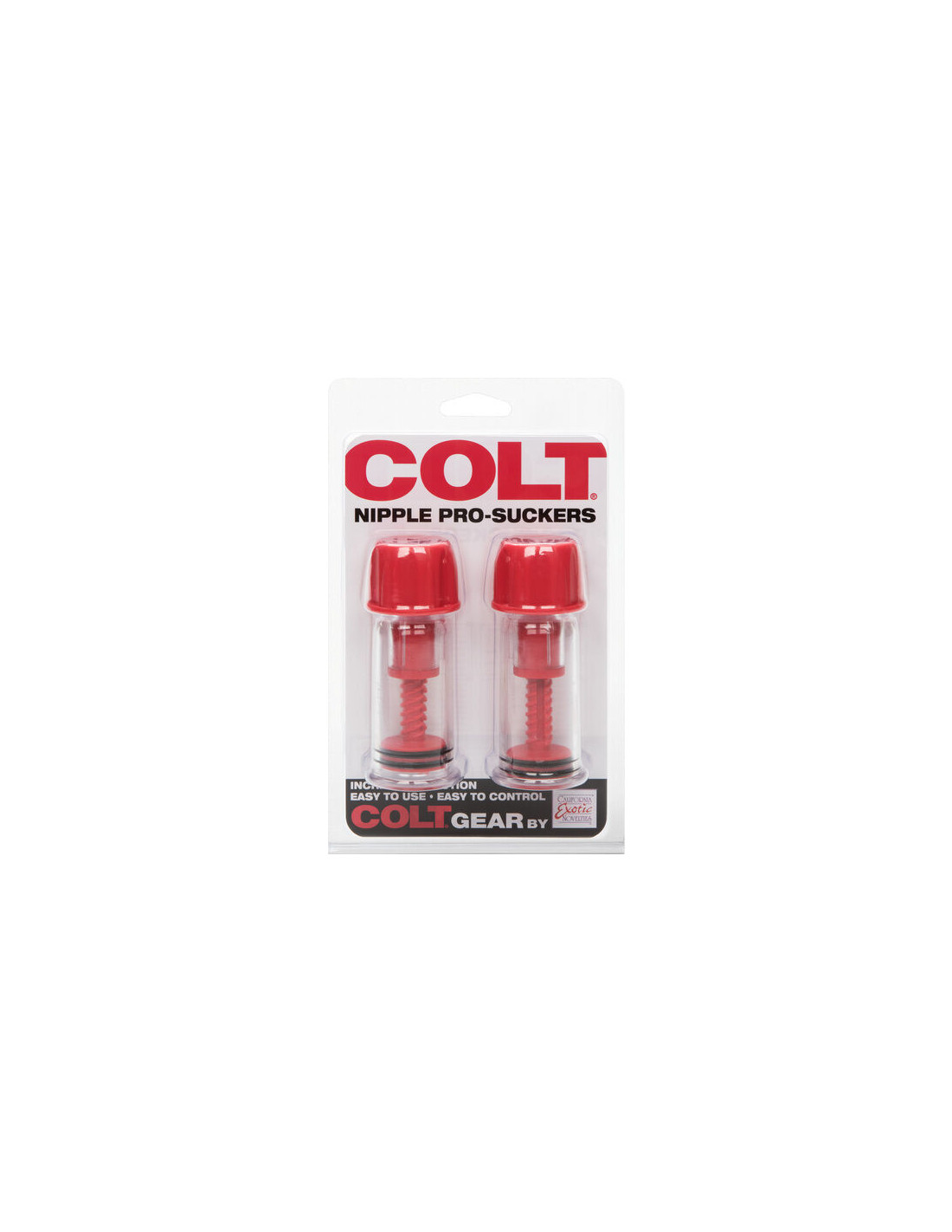 El conjunto Colt Pezón Prosuckers viene en un elegante empaque, moderno y es parte de la colección Colt Gear por CalExotics marca de calidad.