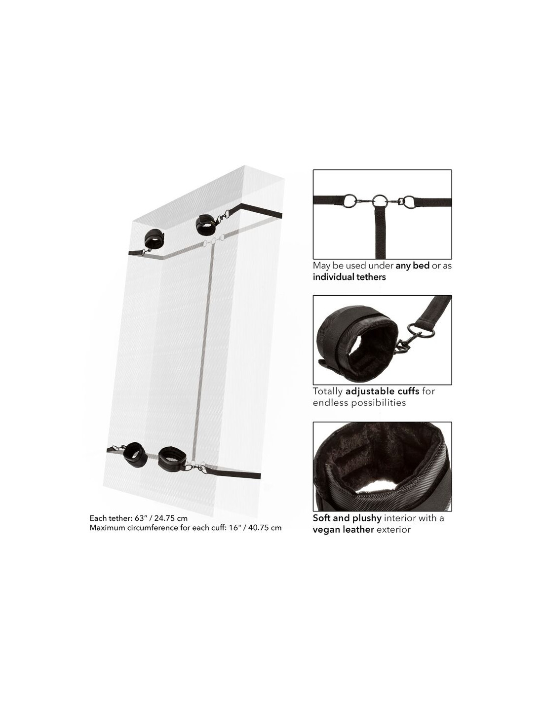 - Información adicional 4 puños de muñeca o tobillo totalmente ajustables y desmontables | 4 robustas correas ajustables para adaptarse a la mayoría de los colchones | Puede utilizarse bajo cualquier cama o como ataduras individuales | Cierres universales y anillos en O con diseño giratorio para una total destreza | Interior suave y lujoso con exterior de cuero vegano | Costuras dobles acolchadas y cosidas | Diseño funcional, duradero y con textura
