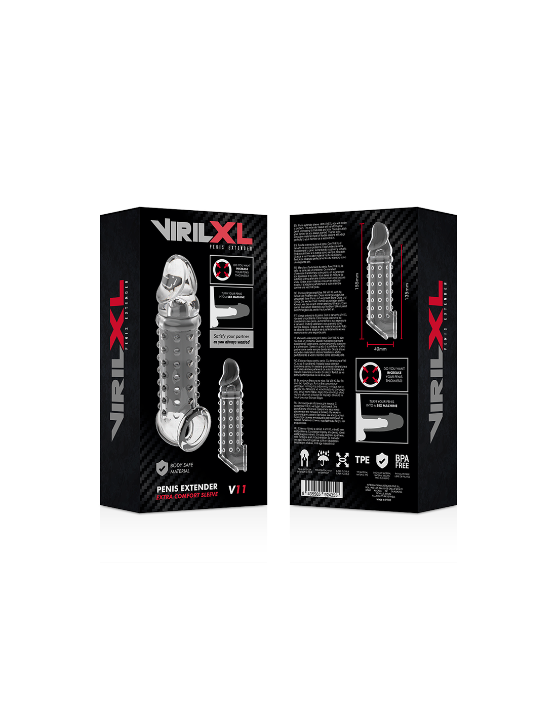 Aumenta tu grosor e intensifica el placer para ambos con esta funda para el pene VirilXL Extensión. Esta suave y elástica manga se puede recortar, para así adaptarse a la mayoría de los tamaños. Simplemente recorta por donde empieza el glande y ya estas listo para la acción. Sentirás cada sensación y tu pareja disfrutará de un nuevo grosor.