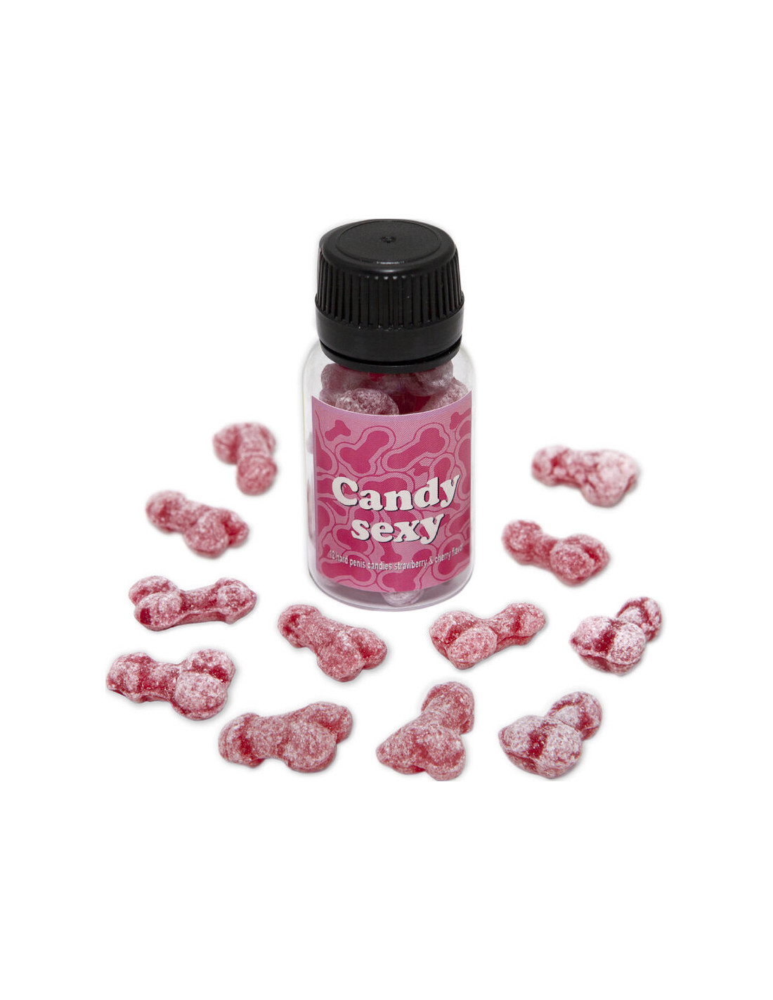 Bote de 12 caramelitos de 25 gramos de peso, en forma de pene con sabor fresa y cereza de color rojo intenso con un sabor extraordinario de fresa con cereza que a las bocas mas exigente les apasionara.