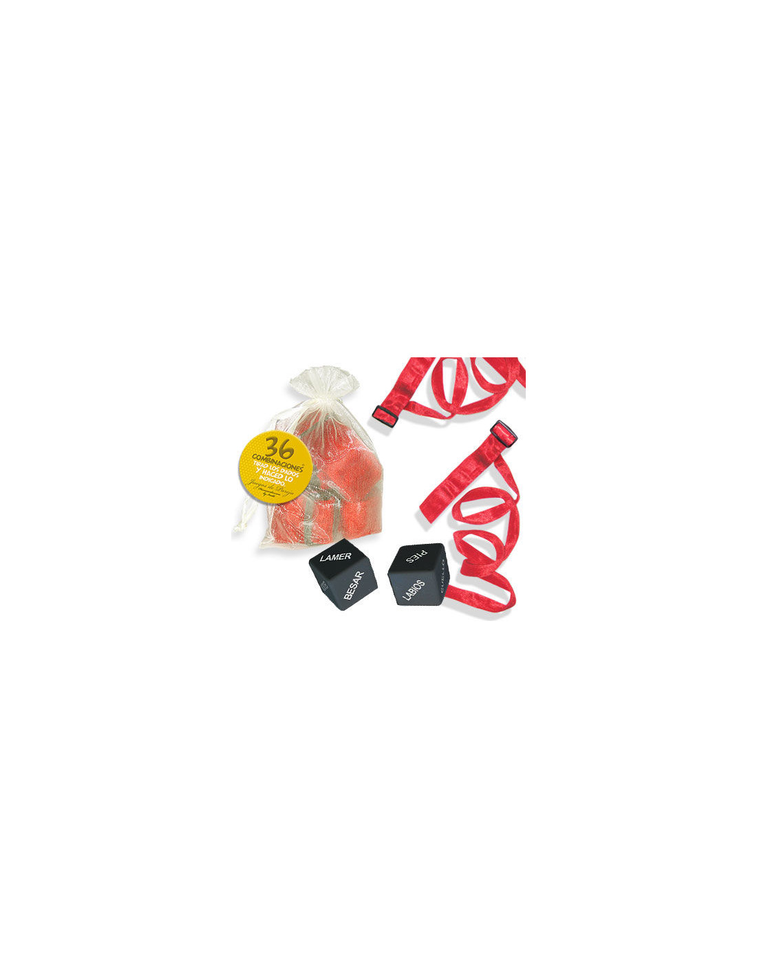 CONTENIDO: 2 Ataduras Bondage Rojas, 2 Dados (Acción/Cuerpo), Bolsa Organza