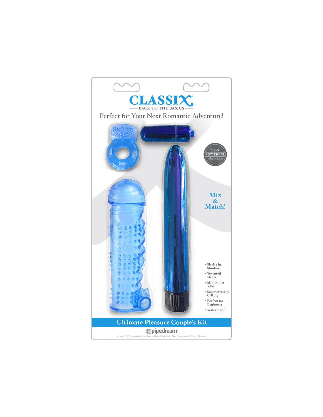 ¡Disfruta de una emocionante variedad y una versatilidad infinita con el kit para parejas Ultimate Pleasure! Los cuatro clásicos favoritos se pueden usar juntos o por separado. El vibrador delgado de 18 cm con múltiples velocidades se puede combinar con la funda texturizada ultraelástica y la potente bala para crear tu propio vibrador superestimulante. Prueba a colocar el anillo en C alrededor de su miembro o testículos, con o sin la bala vibradora, para un emocionante juego sexual. ¡Las posibilidades son infinitas para horas de juego sexual en pareja!