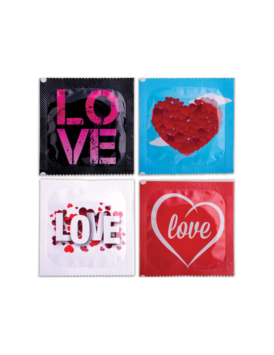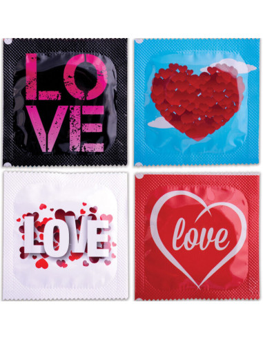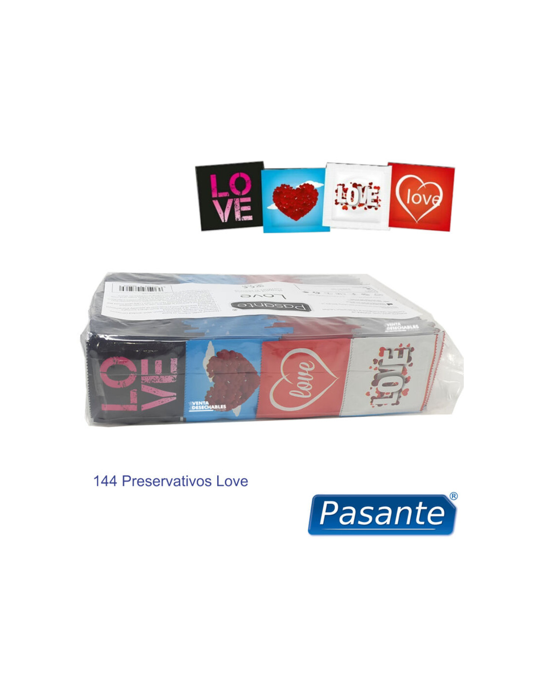 Preservativo love de la marca Pasante ofrecen simplicidad en las formas: comodidad y sensación. Contiene preservativos con 4 símbolos del amor: corazones y letras de amor. Ideales para repartir en fiestas de enamorados, bodas o día de San Valentín.