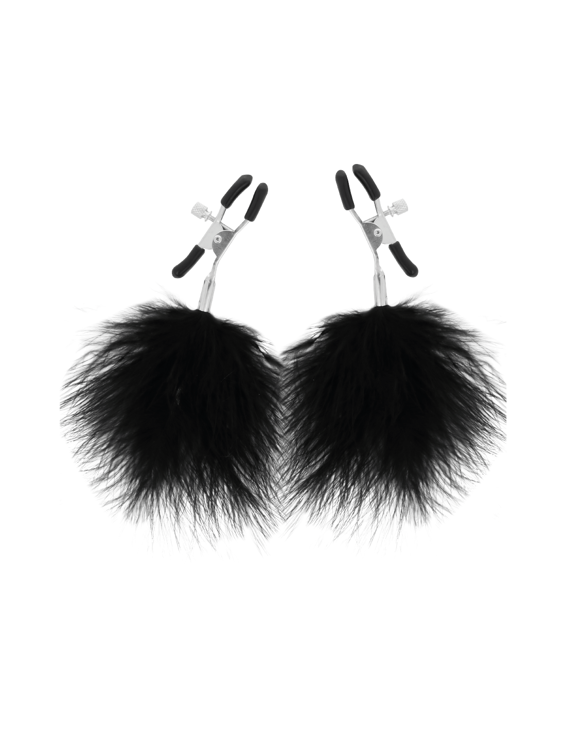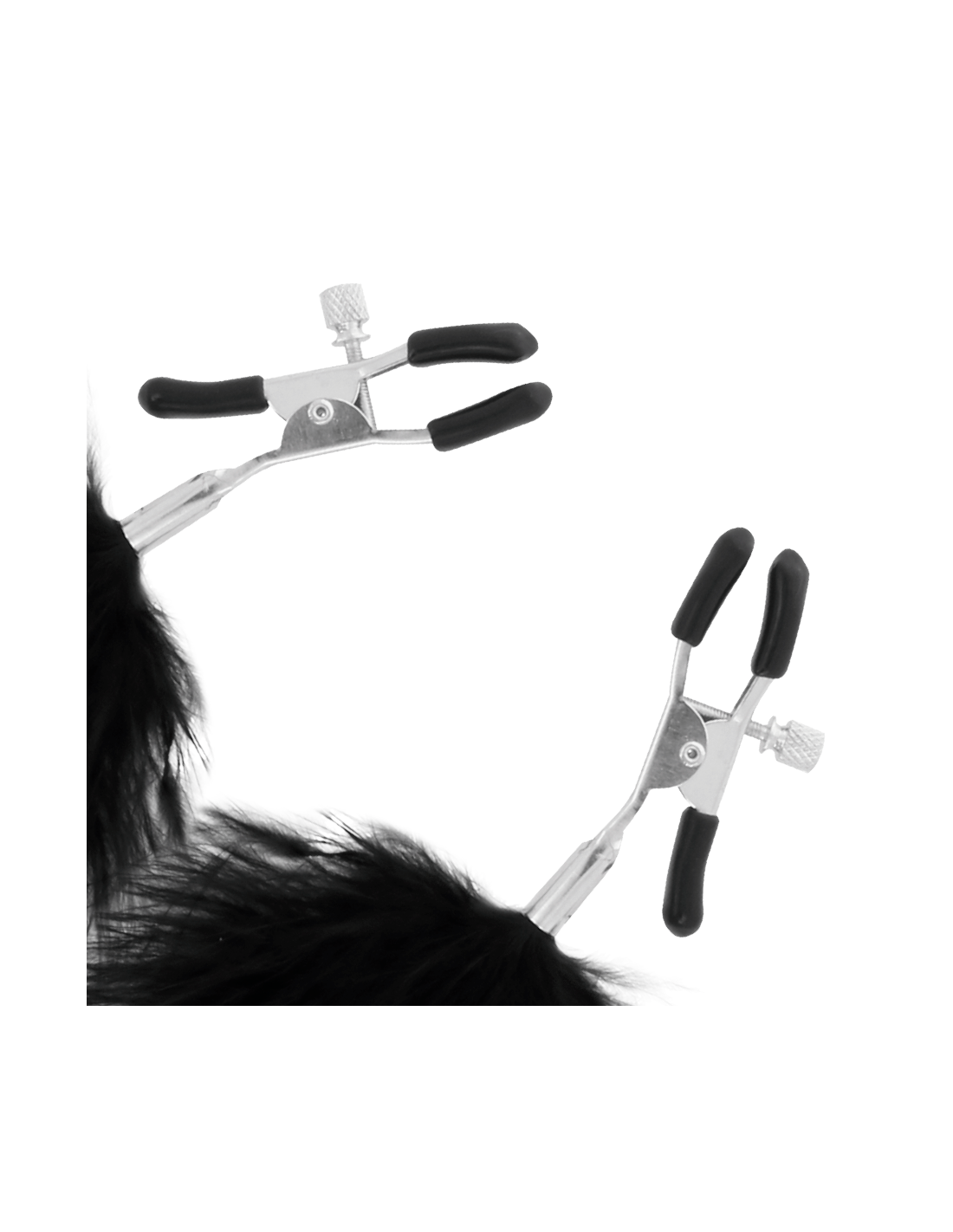 Pinzas para pezones totalmente ajustables para él o ella. Dispone de suaves almohadillas suaves para mayor comodidad y que se puede quitar. Vienen decoradas con dos elegantes pompones.