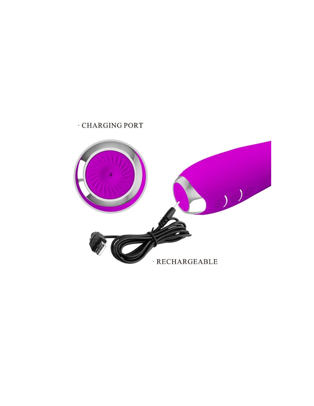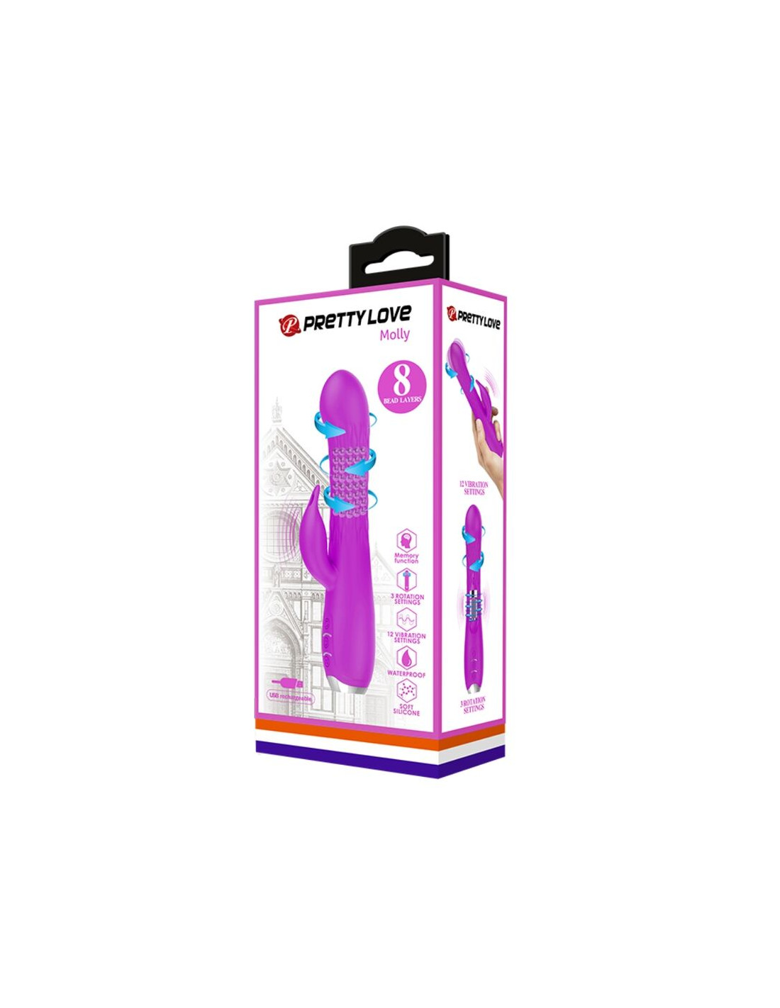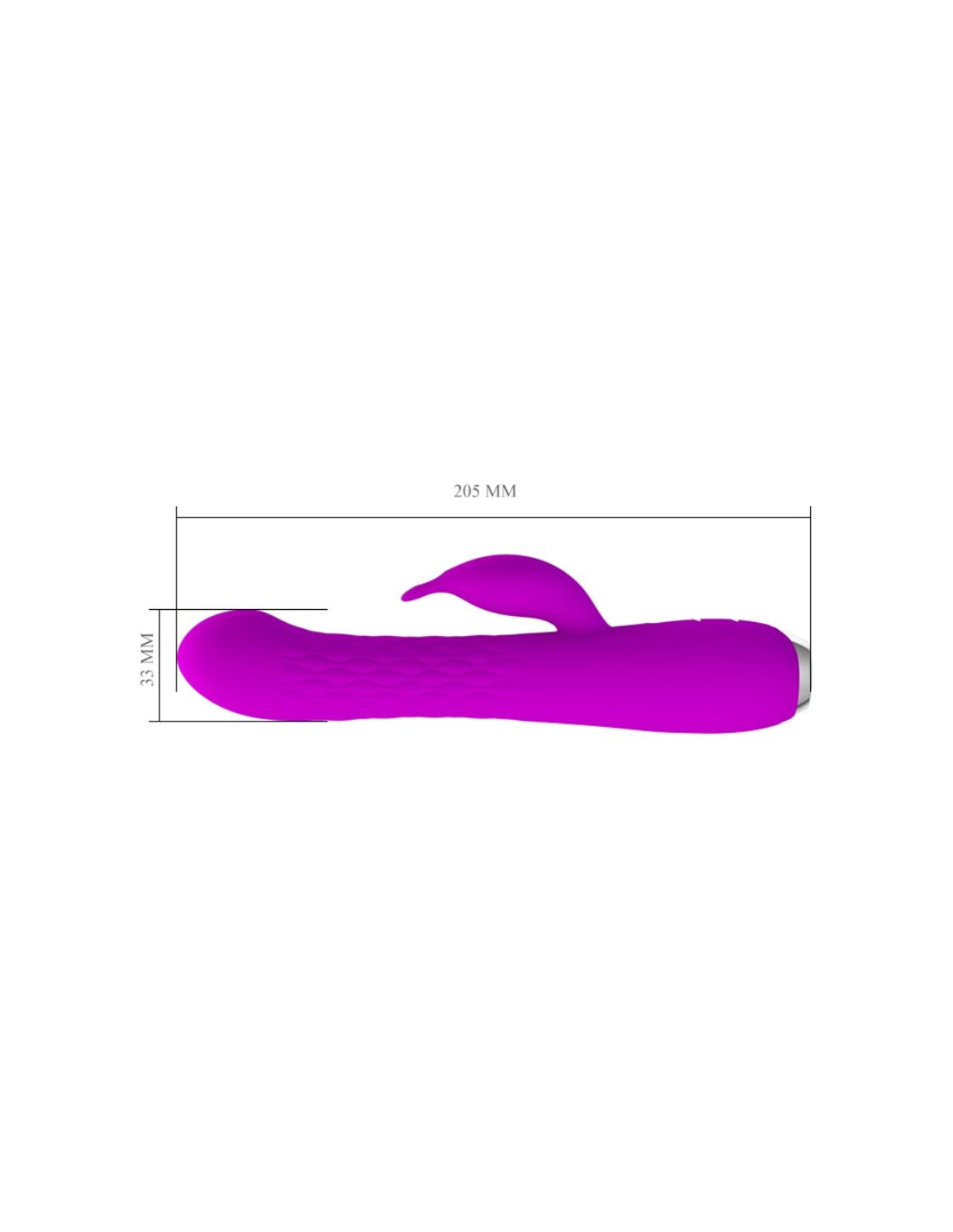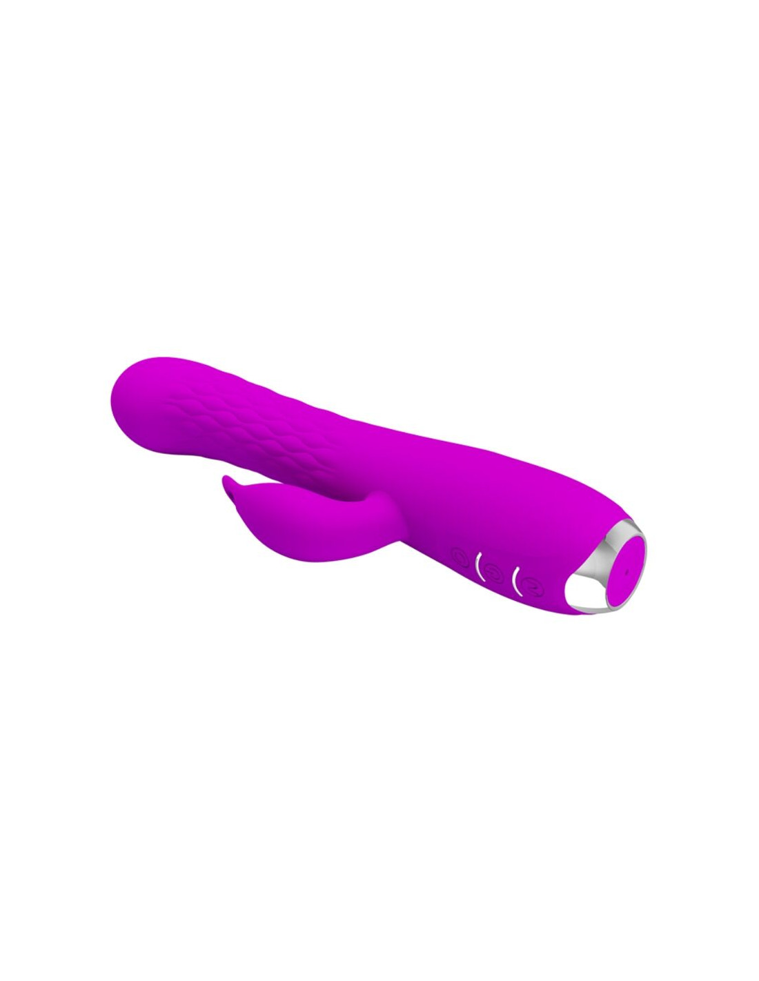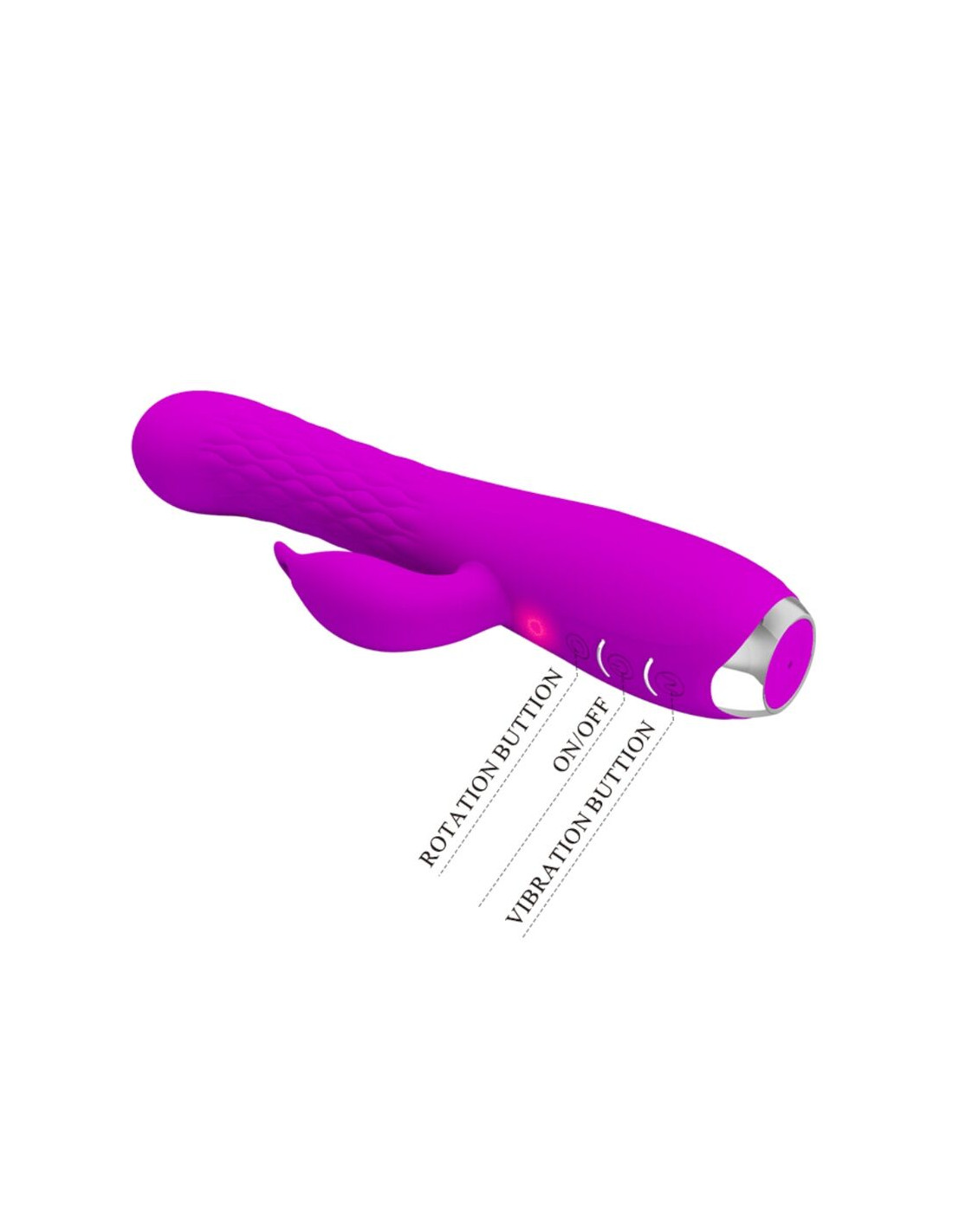 El diseño es ligeramente realista con una punta definida y un eje de rotación con una textura acanalada para una estimulación adicional y el frontal presenta un rabbit para la estimulación del clítoris
