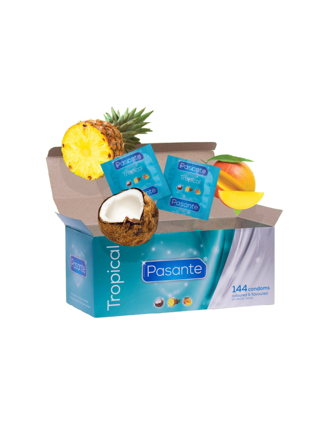 Los condones Pasante Tropical ofrecen tres sabores exóticos; Mango (naranja), Piña (amarillo) y Coco (color natural). Condones lisos.