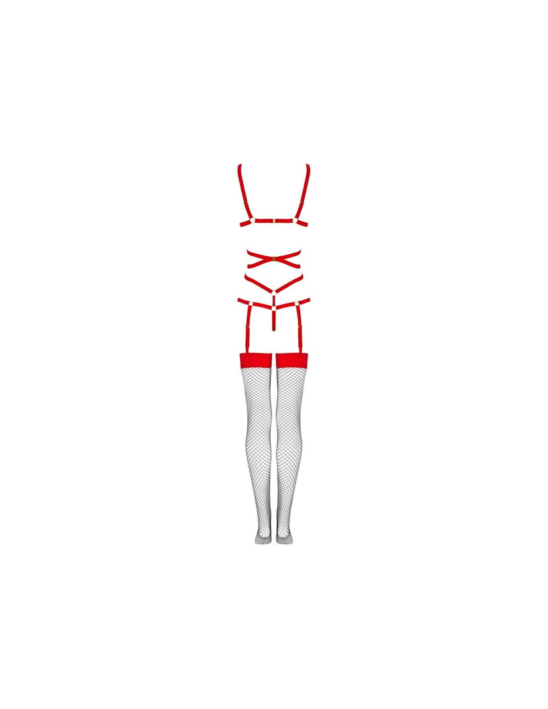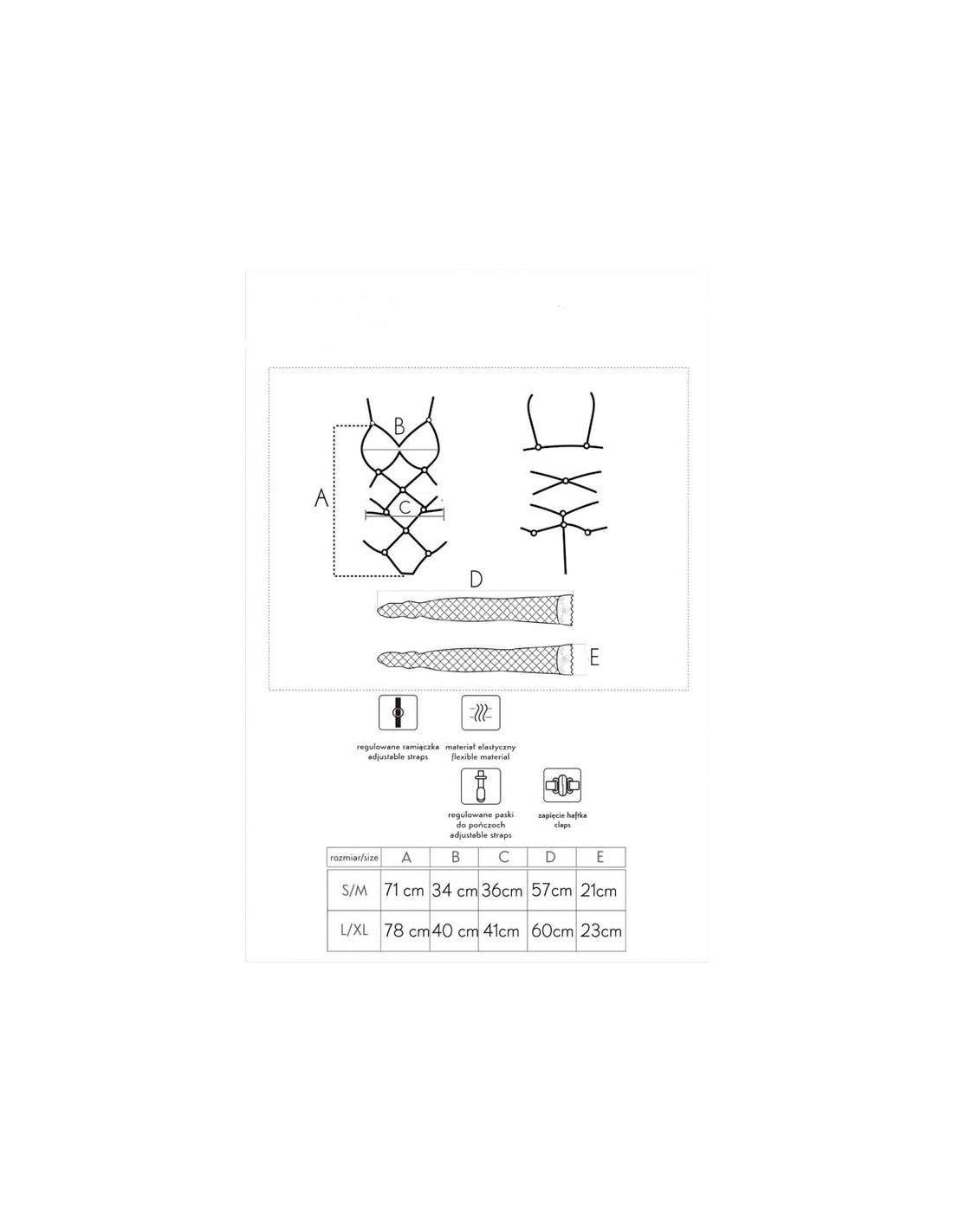 La parte superior del conjunto consta de sexys rayas negras, entrelazadas en el vientre y conectadas con anillos. Los tirantes de la parte superior rodean elegantemente el busto sin cubrirlo, mientras que en la parte inferior se transforman suavemente en un tanga. Tiras individuales corren a ambos lados del tanga, abrazando encantadoramente las caderas. La parte inferior del conjunto se compone de medias negras de largo regulable, confeccionadas en malla. Las medias se sujetan con broches al elemento superior del conjunto, por delante y por detrás.