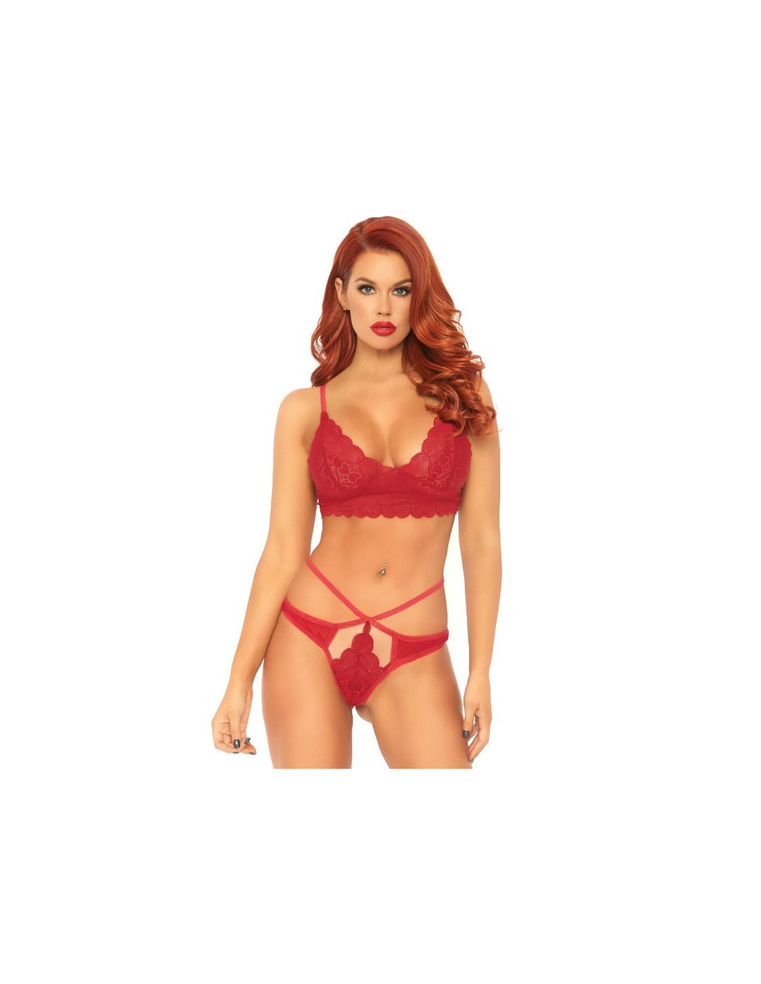 Set de dos piezas compuesto por sujetador de encaje y tanga con recorte a juego fabricado por la prestigiosa marca de lencería Leg Avenue.