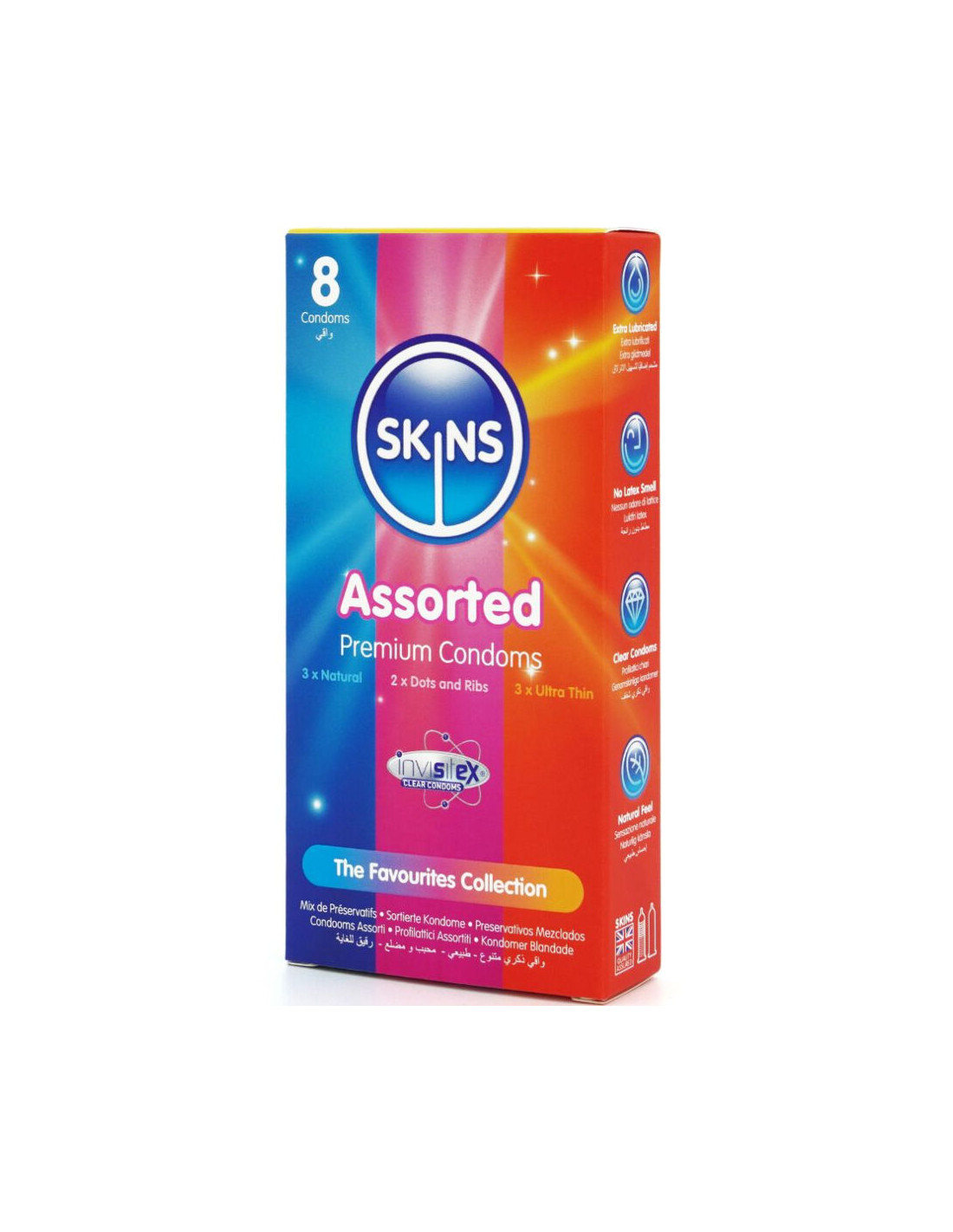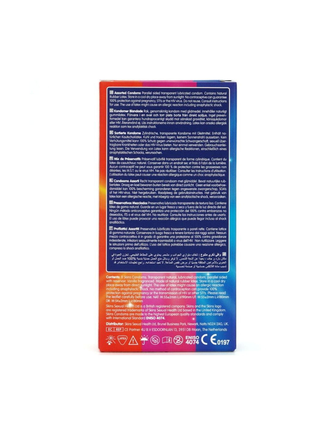 El paquete surtido de 8 Skins es una opción económica y lista para usar que ofrece hasta un 33 % más de condones por paquete que el líder del mercado. Está diseñado para aportar variedad y emoción al pasillo de condones. Este multipack cuidadosamente seleccionado incluye tres de los estilos de condones más populares de Skins: Natural, Dots & Ribs y Ultra Thin, lo que ofrece a los clientes una selección versátil para diferentes preferencias y experiencias de placer.