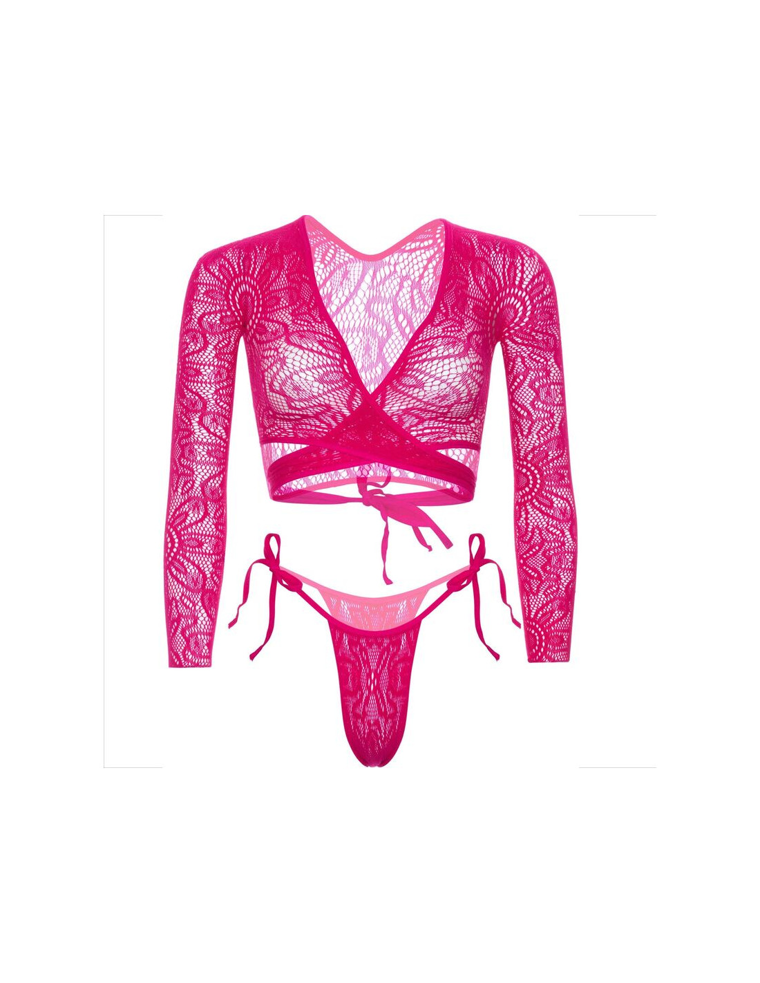 Embárcate en un viaje de elegancia y encanto con nuestro cautivador conjunto de lencería, que presenta un top corto envolvente de encaje y una provocadora braguita con lazo lateral. Este exquisito conjunto fusiona la delicadeza del encaje con detalles cautivadores, creando una experiencia única que resalta tu feminidad con un toque de estilo juguetón.