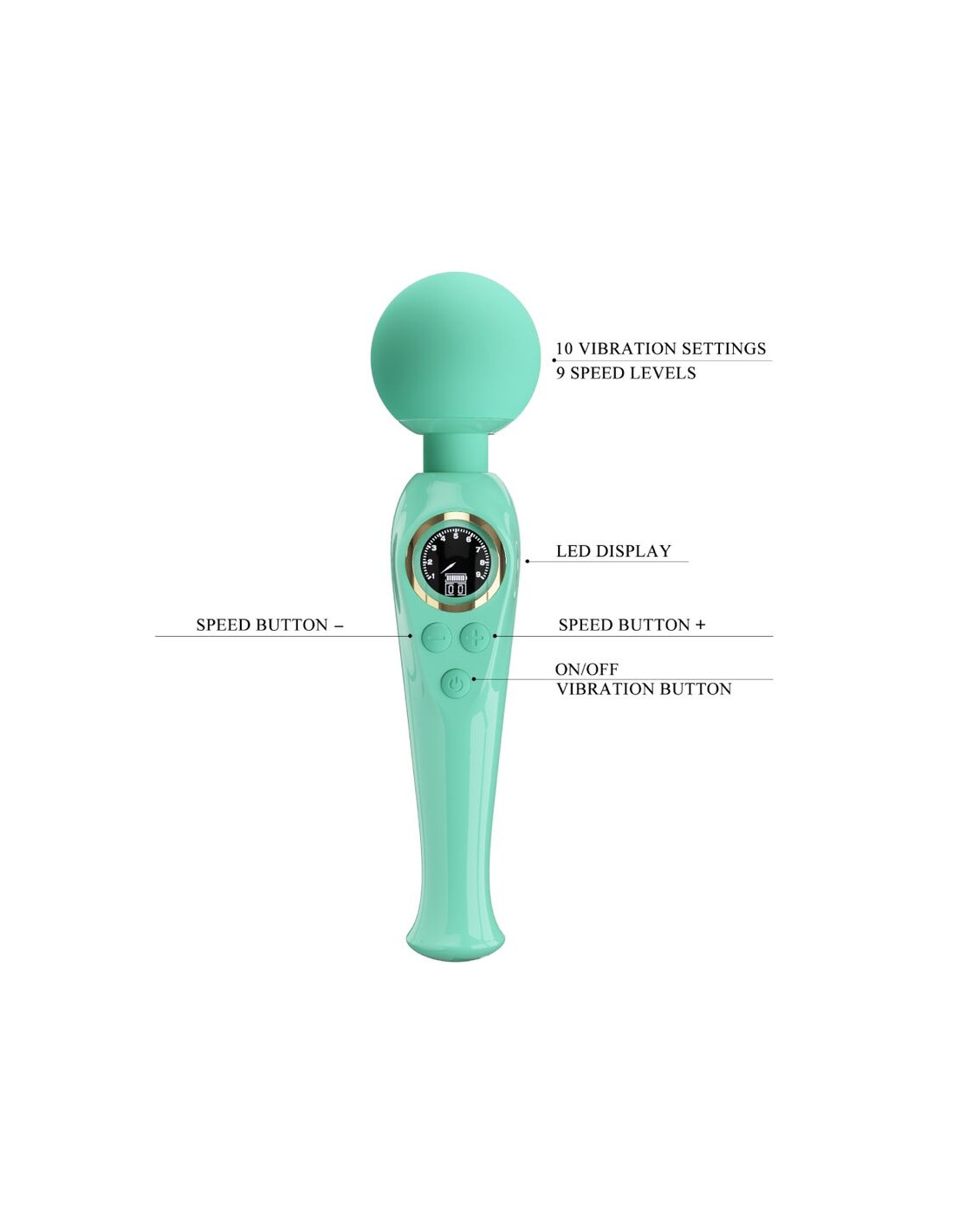 - Función: 10 funciones de vibración + 9 niveles de control de velocidad