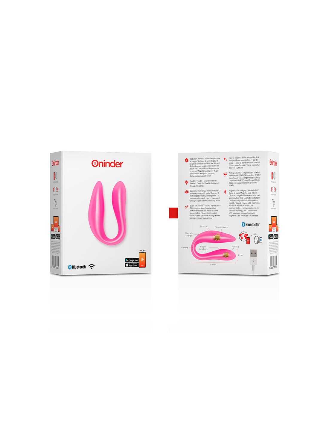 Con este vibrador no solamente puedes elegir entre combinaciones de intensidad y vibraciones preestablecidas, sino que también puedes compartir a un innovador control basado en una aplicación. Simplemente tienes que descargar la aplicación gratuita ONINDER en tu dispositivo Android o iOS y conectar tu smartphone o Tablet.