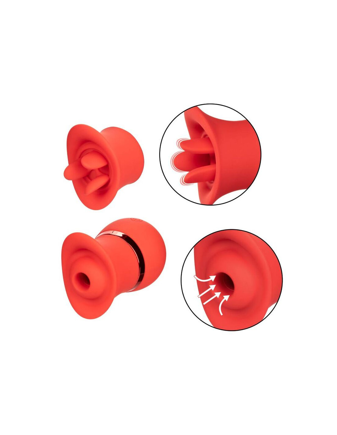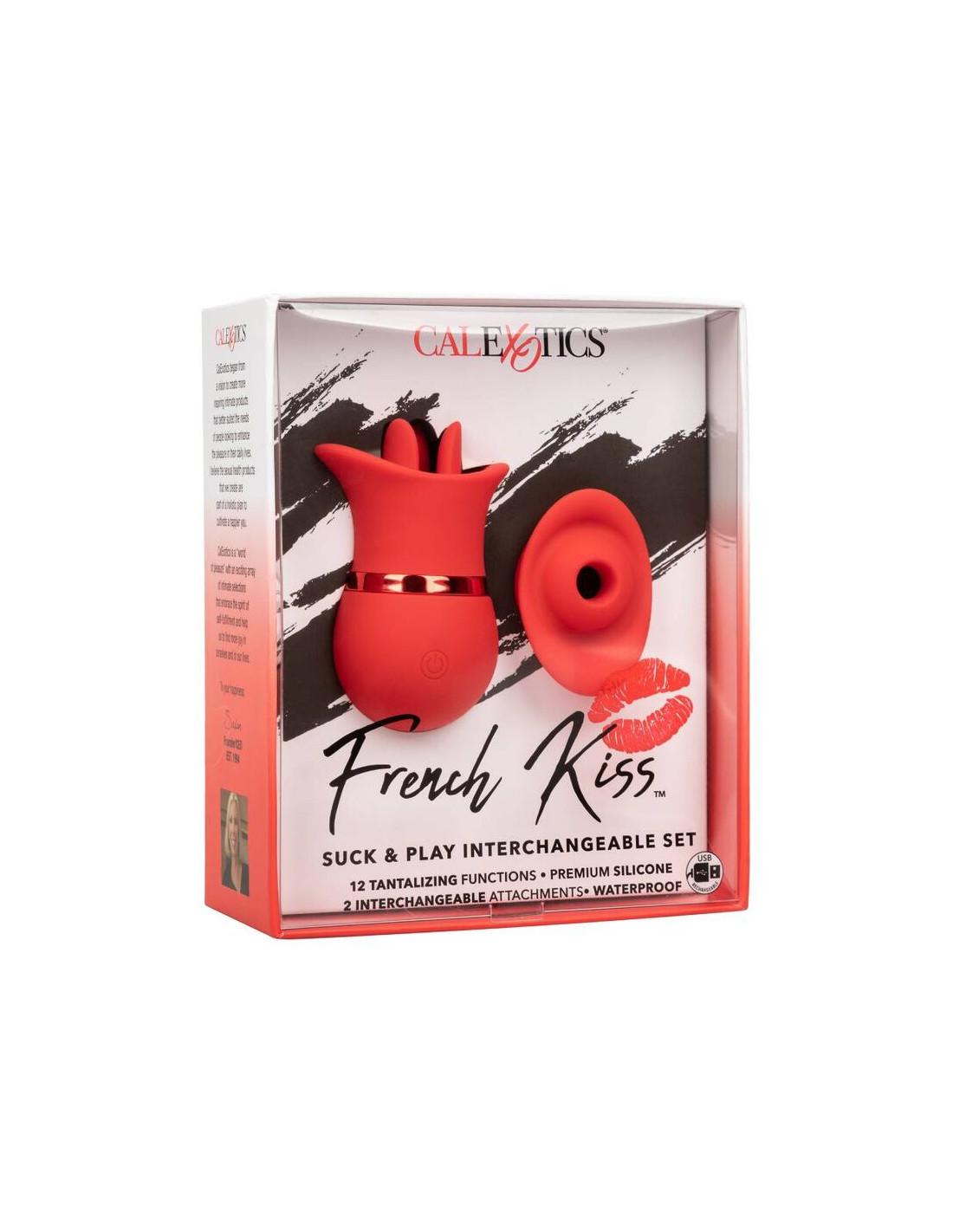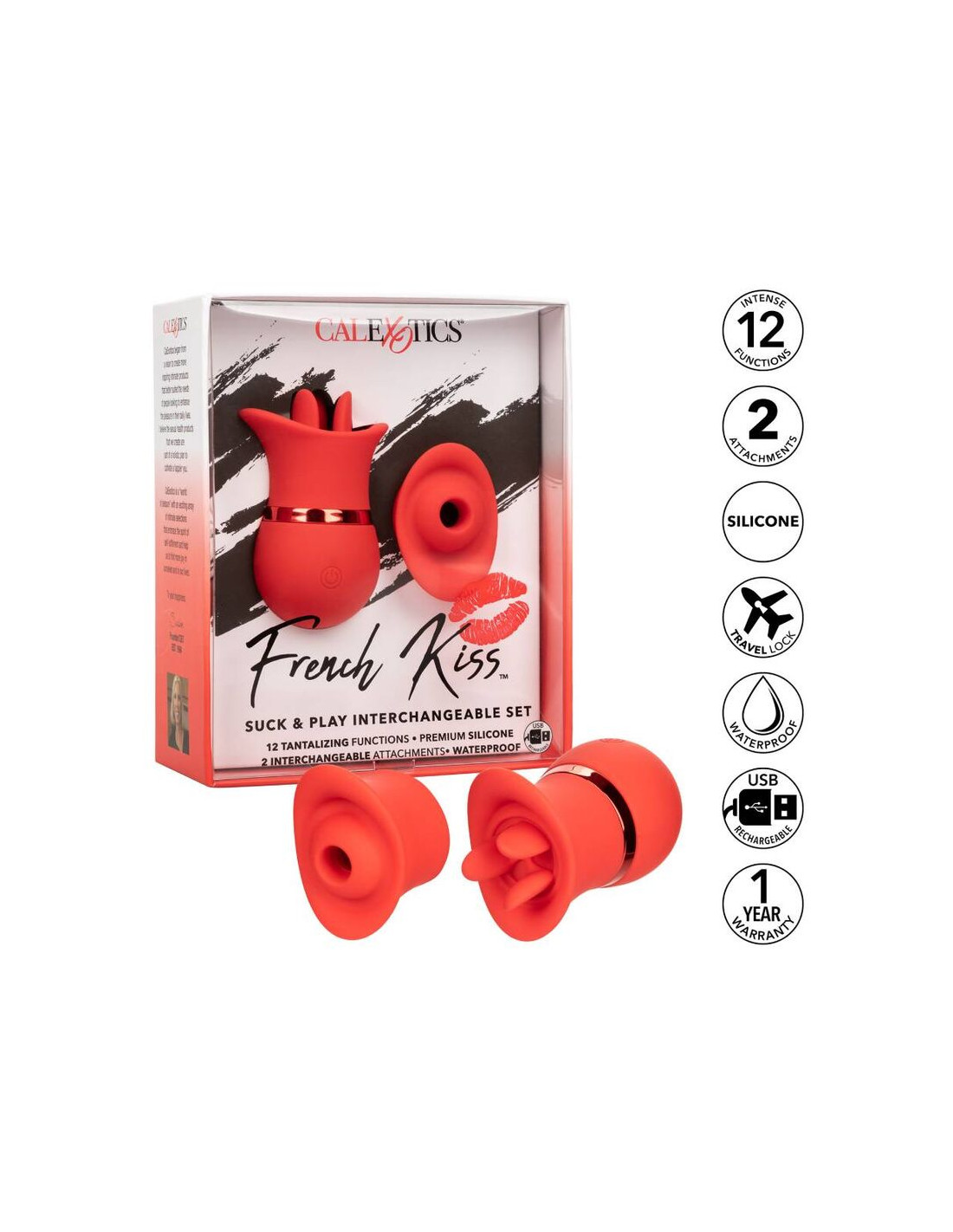 Dos veces el placer, oh la la! El sensual conjunto intercambiable de chupas de besos franceses es justo lo que necesita con 2 accesorios intercambiables con 12 funciones de vibración o 12 funciones de succión. La primicia de contacto completa y el teaser de triple lengua aleteo han sido diseñados para contornear perfectamente a sus puntos de placer más íntimos con 12 funciones intensas. Cambie en el encasador sensualmente contorneado y disfrute de 12 funciones de succión emocionante o disfrute de un verdadero beso francés con 12 funciones de acción parpadeante. La silicona suave y flexible y el cuerpo sensualmente contorneado le permiten entregar un placer identificado desde casi cualquier ángulo. Use el botón de fácil toque para controlar hasta 50 minutos de placer. Recargue su placer en solo 1 hora con el cable USB proporcionado en el puerto de carga de autoselección en el masajeador. El tamaño discreto y el botón de bloqueo de viaje del mini masajeador lo convierten en el compañero de viaje perfecto, lo que le permite abrazar el placer radiante donde las fantasías lo lleven .