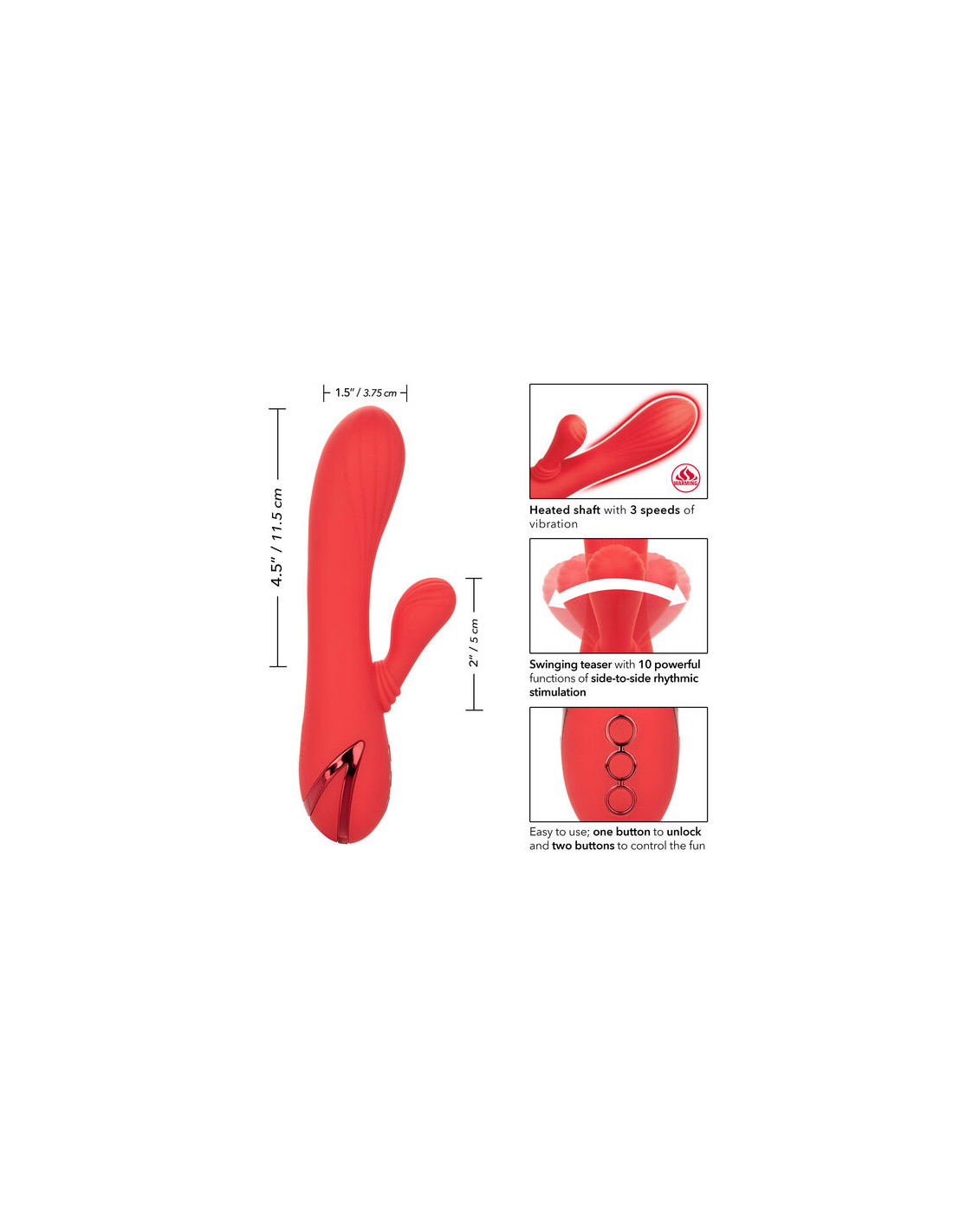 El lujoso vibrador de conejo calentado tiene un estimulador rítmico de lado a lado único en su tipo para una estimulación externa alucinante. Ya sea que esté buscando subir el calor con un amante o simplemente disfrutar de un momento sensual a solas, este deslumbrante masajeador térmico está listo.