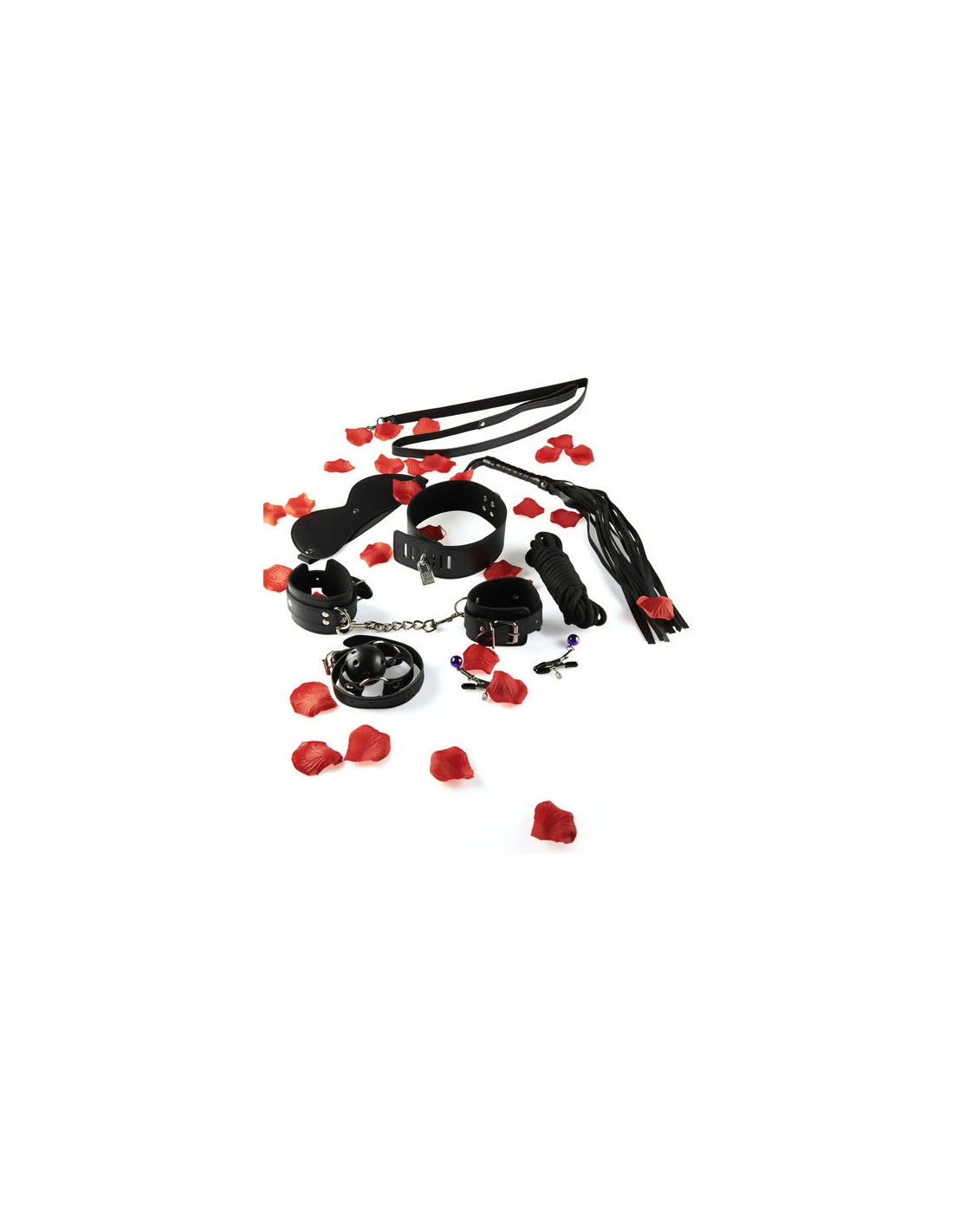 - Compuesto por una máscara, unas pinzas para los pezones, un collar, un látigo, una cuerda de algodón y una mordaza.