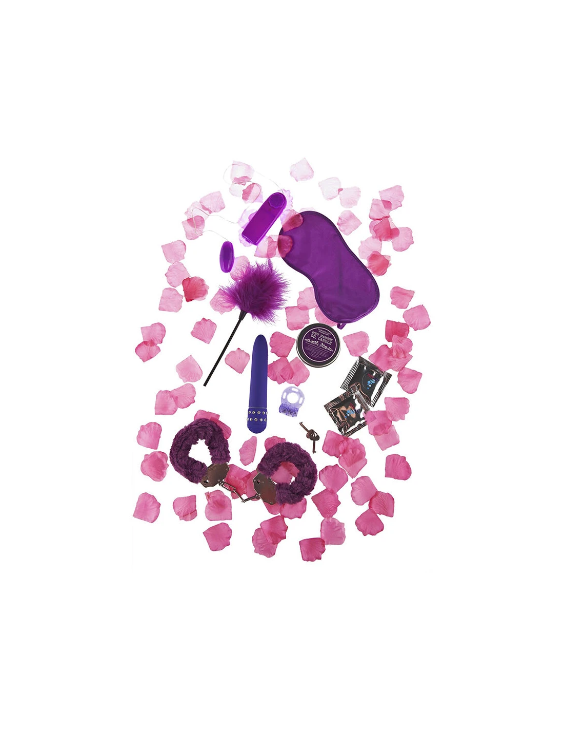 La caja Super Sex Bomb tiene un diseño llamativo, con un gran lazo morado estampado que le da un toque festivo. En su interior, tus clientes encontrarán esposas, un vibrador, un huevo vibrador, un cosquilleo de plumas, pétalos de rosa, un antifaz, un anillo vibrador para el pene de un solo uso, lubricante y una vela de masaje. Pilas: 2 AA, 2 AAA (no incluidas). Fabricada en plástico ABS, TPR, metal, poliéster y plumas de pavo.