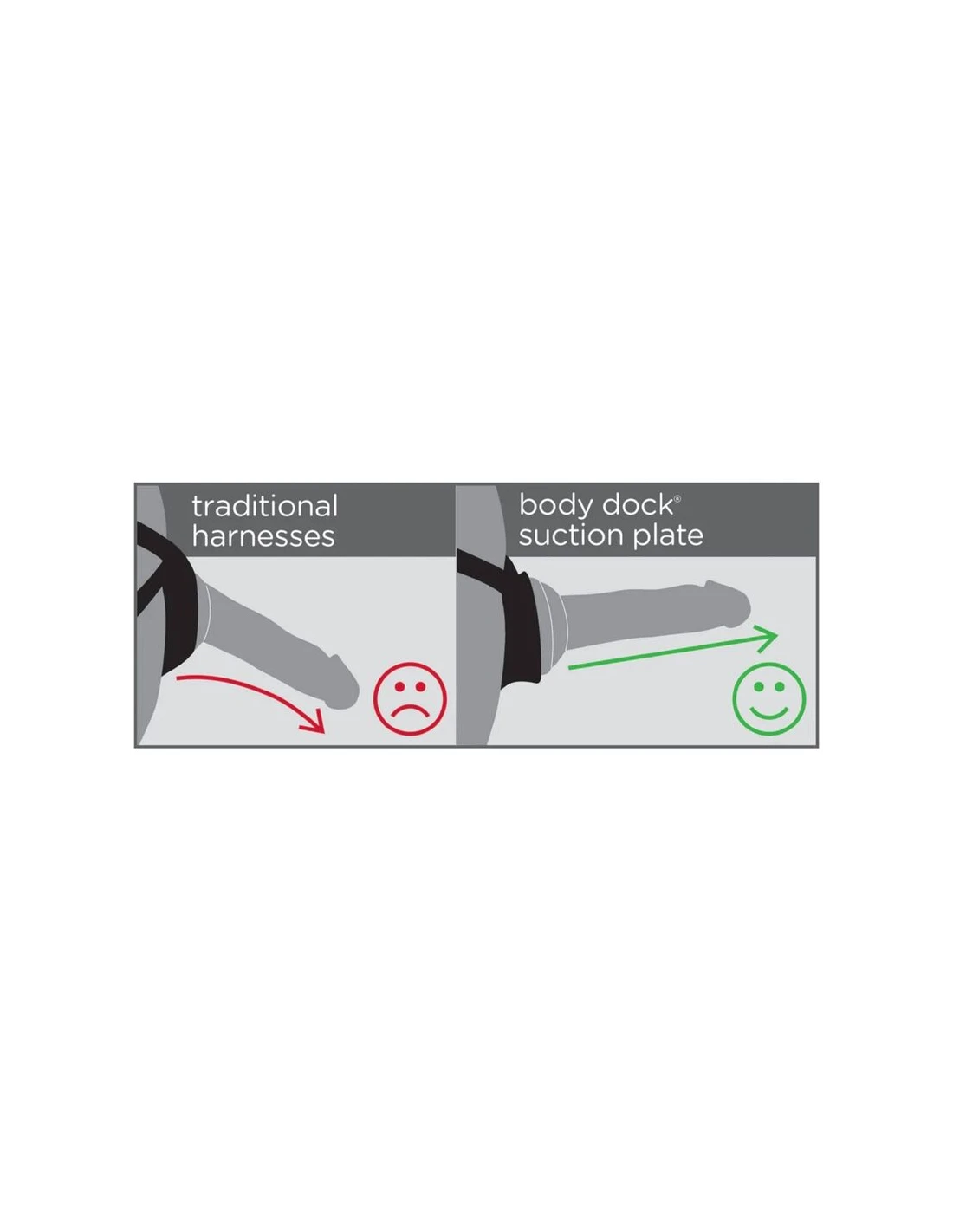 ¡El sistema de arnés universal patentado Body Dock es el Body Dock más fácil y cómodo que hemos fabricado! Es tan simple como conectar la ventosa de este consolador Dillio de silicona platino a la placa de acoplamiento de silicona. Sin anillos. Sin instantáneas. Sin complicaciones. Lo mejor de todo es que funciona con la mayoría de los consoladores del mercado actual, incluidos algunos que ya tienes.
